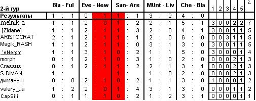 melnik-a Member 16.09.10 #21 Блекберн - Фулхем 1-1 Эвертон - Ньюкасл 2-0 Сандерленд - Арсенал 1-2 МЮ - Ливерпуль 2-1 Челси - Блекпул 5-1