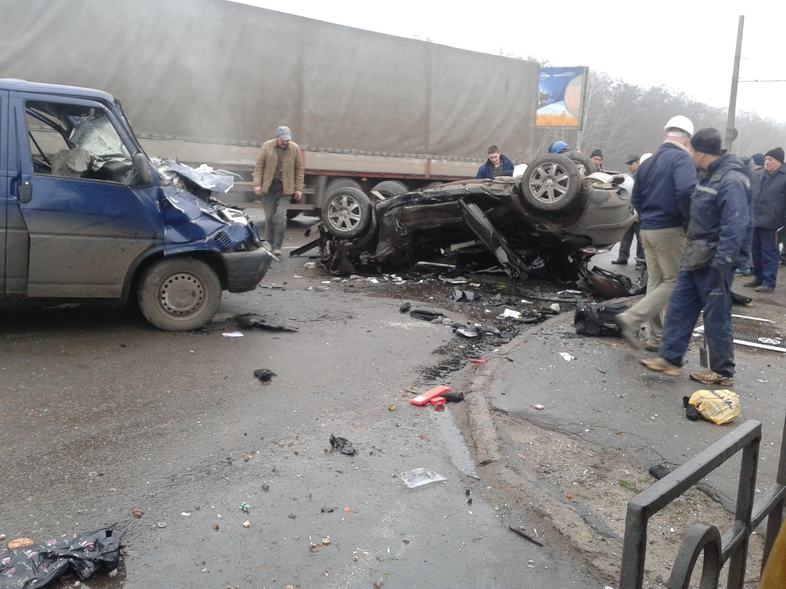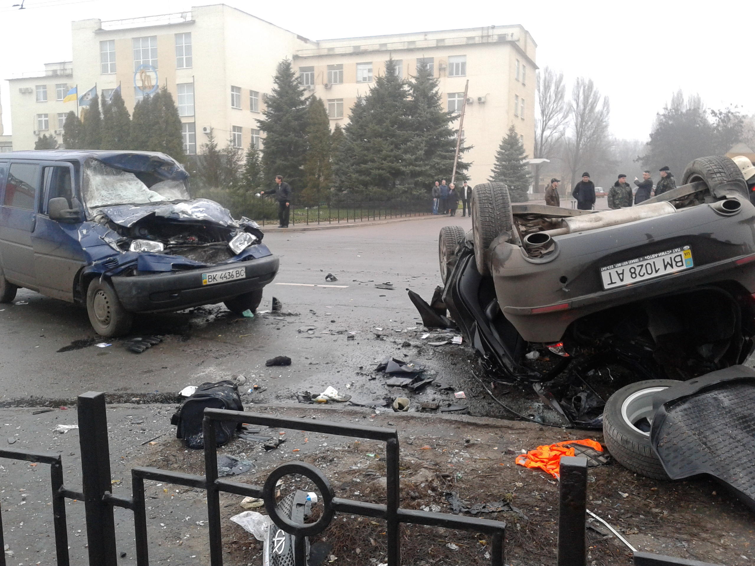 Сегодня 28.11.12 в 11.30 возле заводоуправления "Сумыхимпром". Один труп, одного скорая увезла. Еще один участник -- мусоровоз (на фото не видно, стоит за остановкой в сторону города). Подробности не известны.