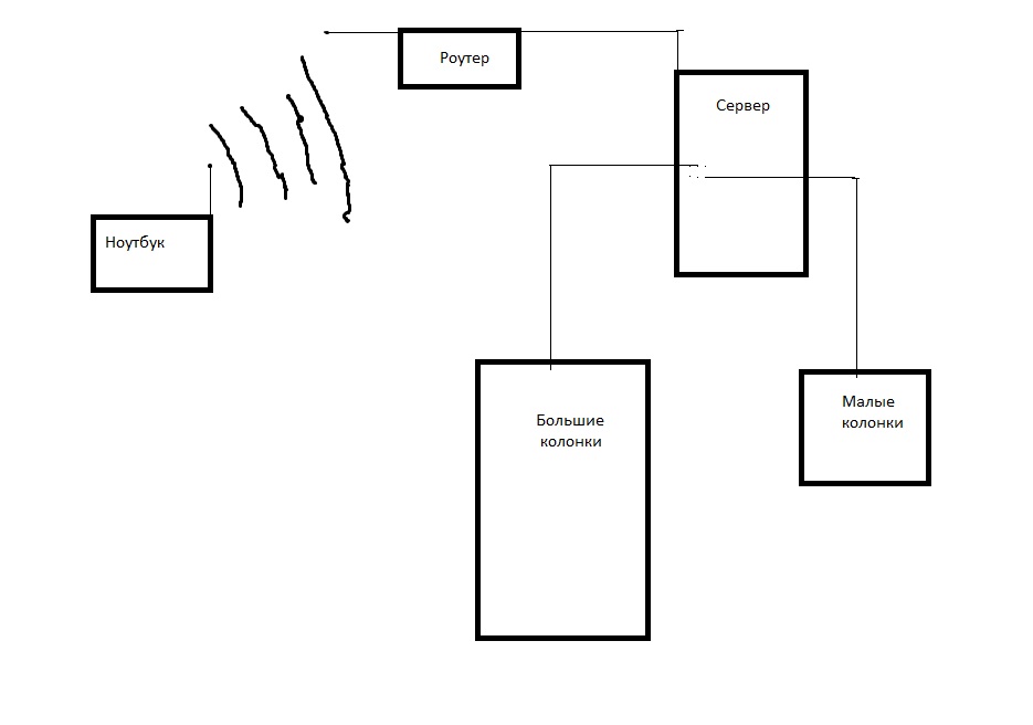Звук идет от ноута через роутер на сервер, оттуда выходит через аудиовыход "а". Через аудиовыход "б" выходят колонки, через которые воспроизводится музыка напрямую с сервера(выполняет роль музыкального центра).