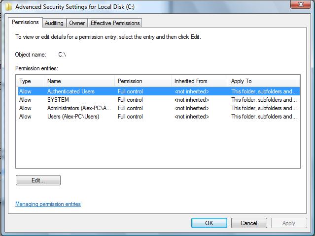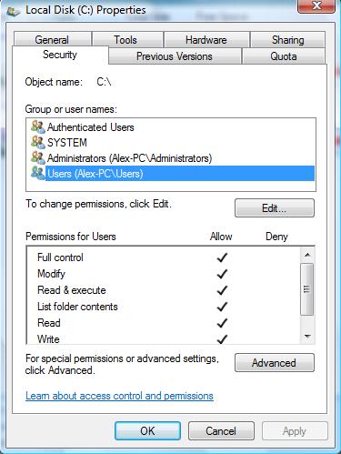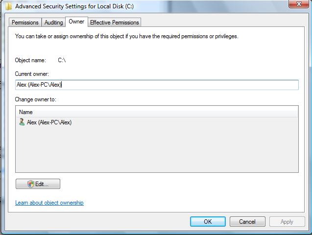 Прм копировании/перемещении на C:/ постоянно требует подтверждение на запись, на вкладке всех папок, в т.ч. и на С: стоит везде Permissions на всех юзерах Allow all. Каким образом убрать запрос на разрешение? (Owner - моя учётка)