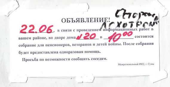 И это.... В Сумах дело с детьми войны имеют только ПЕНСИОННЫЙ ФОНД и УПРАВЛНИЕ ТРУДА И СОЦЗАЩИТЫ НАСЕЛЕНИЯ. Только эти организации могут что либо "делать" и то, о изменении в законодательных нормах, сокращающих или расширяющих права этой льготной категории населения объявят в СМИ, и никто не будет ходить раздавать "одноразовую помощь". Просто зачислят на счета (пенсионный, либо счет указанный при оформлении заявления на помощь, как это делается при получении компенсации для приобретения твердого топлива и сжиженного газа).