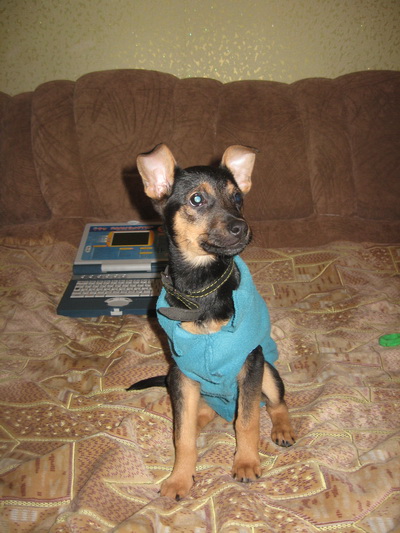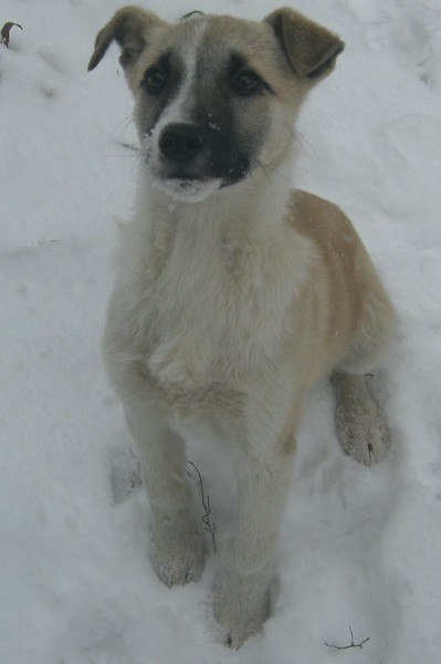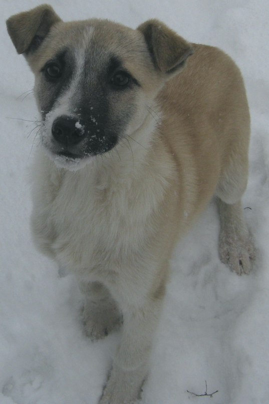 оттенка с белой грудкой и в белых носочках,сидит почти всегда под торговым киоском, как будто ждет кого-то.