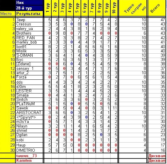 P.S. taurus__73 снят с чемпионата по его собственной прозьбе. D!METRIO, Haup, Brothers будут дисквалифицированны после следующего тура, если ихнего прогноза не будет.