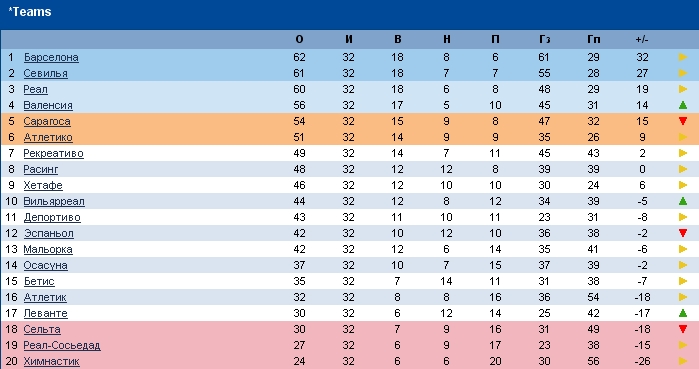 D dds Active Member 30.04.07 #437 6.05.07 Депортиво - Валенсия 1:2 6.05.07 Мальорка - Осасуна 2:3 6.05.07 Сарагоса - Расинг 2:0 6.05.07 Эспаньол - Атлетико 2:1 6.05.07 Реал - Севилья 2:1