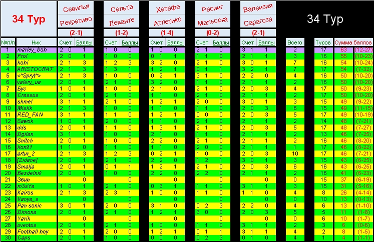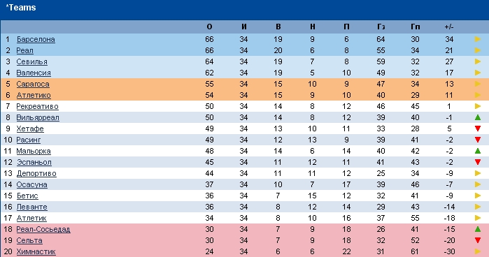 Re: 34 тур Результаты: Севилья - Рекреативо 2-1 Сельта - Леванте 1-2 Хетафе - Атлетико 1-4 Расинг - Мальорка 0-2 Валенсия - Сарагоса 2-0