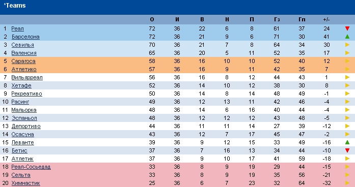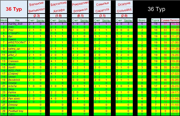 D dds Active Member 29.05.07 #550 Барселона - Эспаньол 3;2 Бетис - Осасуна 0:1 Мальорка - Севилья 0:2 Сарагоса - Реал 1:2 Депортиво - Рекреативо 1:0