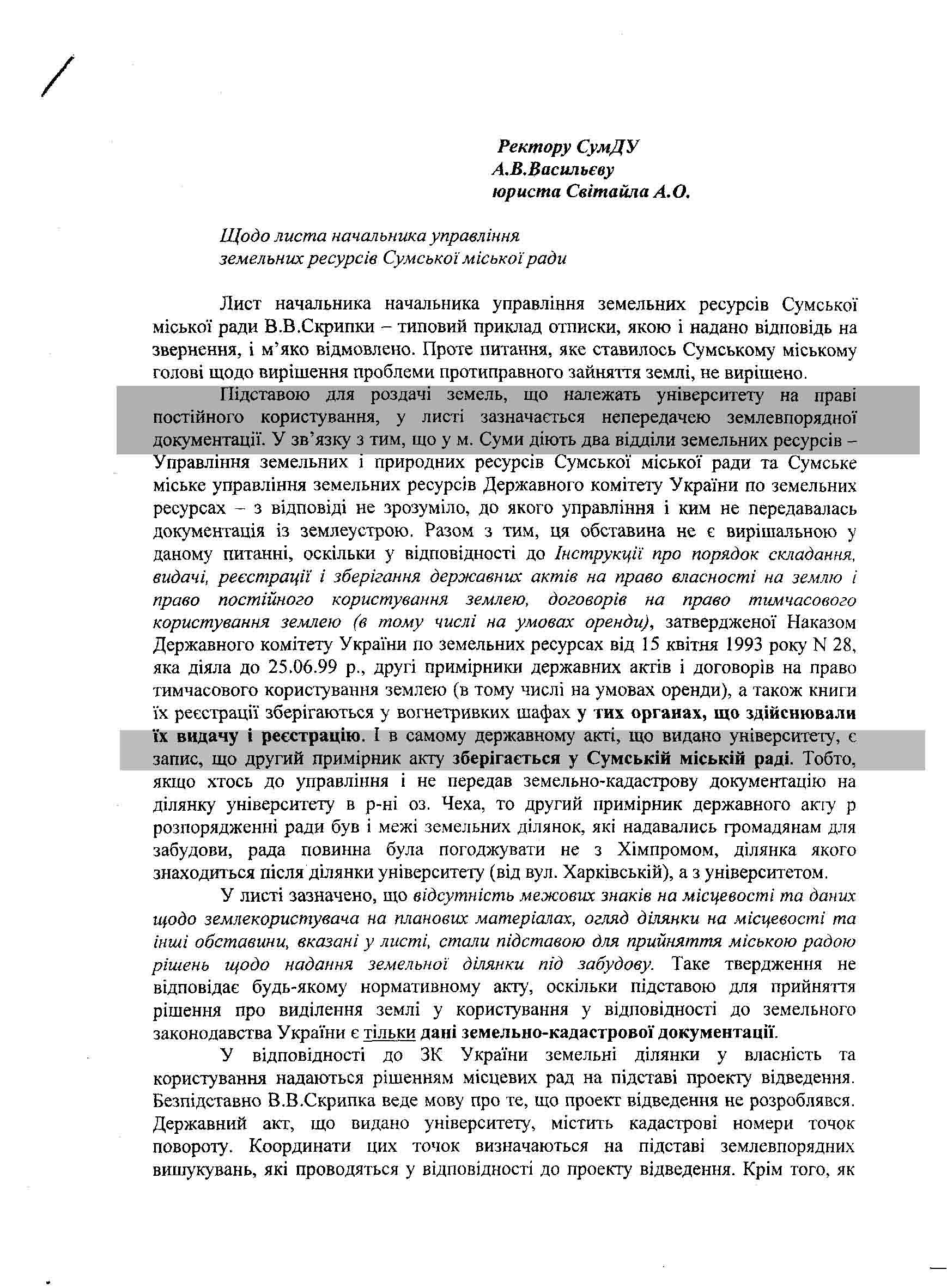 Пляцук Л.Д. вкрав цю ділянку в СУМДУ і без жодних документів звів на ній палац і продовжує нею користуватись, навіть після її вилучення прокуратурою і міською радою.