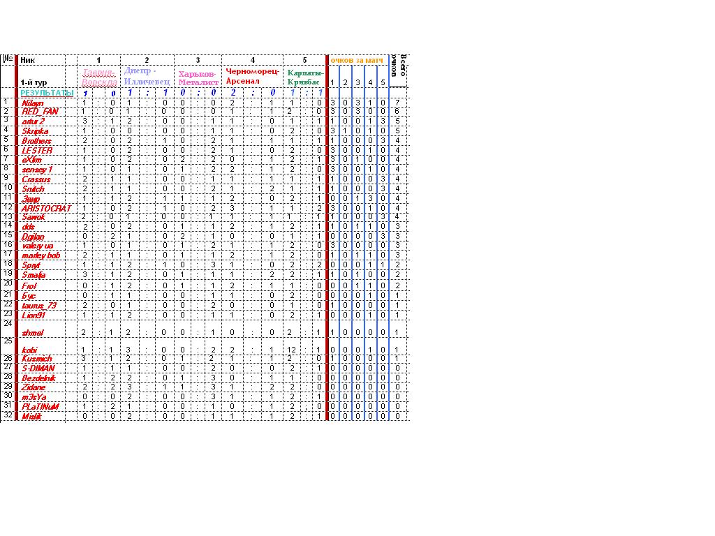 RED_FAN Smilek 03.03.07 #35 Дніпро - Іллічівець 1-0 Чорноморець - Арсенал 1-1 ФК Харків - Металіст 0-0 Таврія - Ворскла 1-0 Карпати - Кривбас 2-0