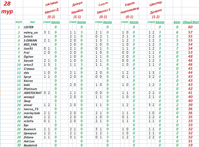 Таблица после 28 тура чемпионата Украины.