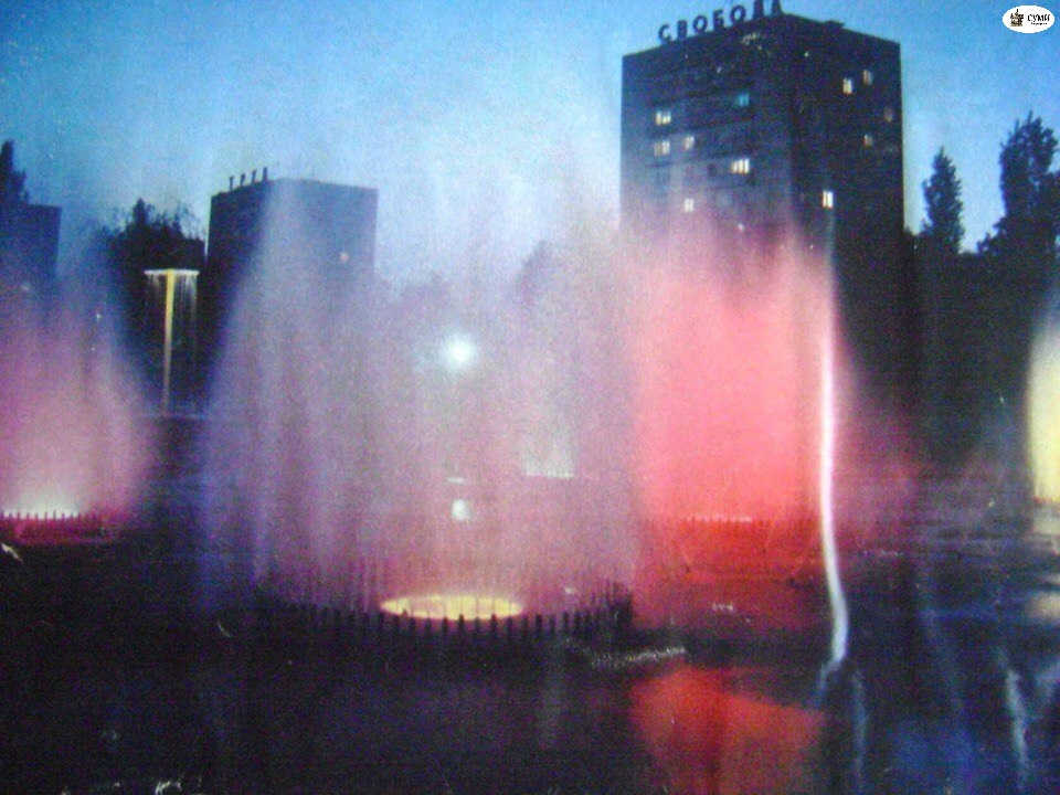 По словам директора Сумского областного краеведческого музея Владислава Терентьева, освещение фонтана формировало полторы сотни обработанных цветных ламп. Фонтан построили за полтора месяца и приурочили до 58-й годовщины Октябрьской революции.