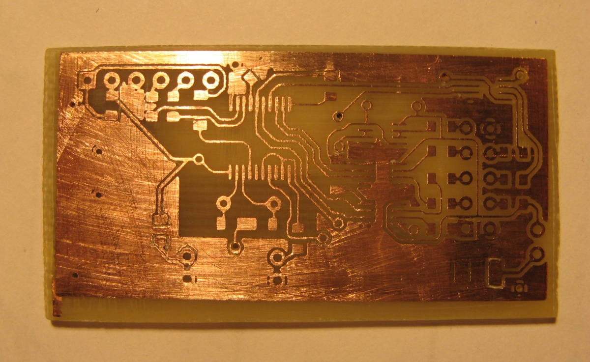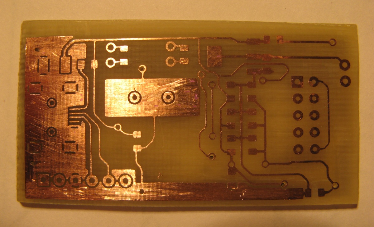 Возьму на заметку. А утюжили на какой температуре? Или холодным? И еще мне в той статье понравилось, что он поверхность подвергает "микротравлению" (с) (вообще то это химическое полирование)... Я таким способом обрабатываю готовую плату, перед лужением. Кстати, чтобы получить более равномерный черный цвет (без белых крапинок) я беру фотомаску (трафарет) и коробку из селедочных пресерв (чистую, конечно), на нижнюю (внутреннюю) плоскость крышки приклеиваю трафарет тем же двусторонним скотчем (тут кто как управится), оставив непокрытым тонер, обращенный к дну коробки. В коробку наливаю ацетона (2-3 столовые ложки, лишь бы покрыло дно пресервы) закрываю все это дело и на батарею, мин на 3-5 (подбирается с конкретным тонером), время от времени провожу визуальный контроль. Под воздействием паров ацетона (а они конденсируются на более холодной крышке), и капиллярного эффекта, все поры в тонере затягивает ацетон, который в них же и конденсируется, и получается хороший черный негатив.Сам мучалсяПока не стал приглаживать фоторезист через газетку утюгом. Главное без фанатизма, потом держится - зубами неотдерешь)