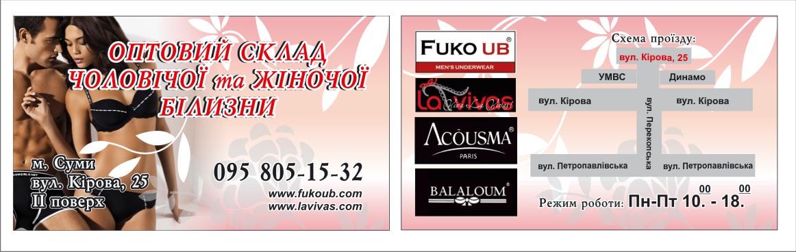 Наша компания является региональным представителем ТМ Fuko UB и ТМ Lavivas (нижнее бельё) в Сумской и Полтавской областях.
