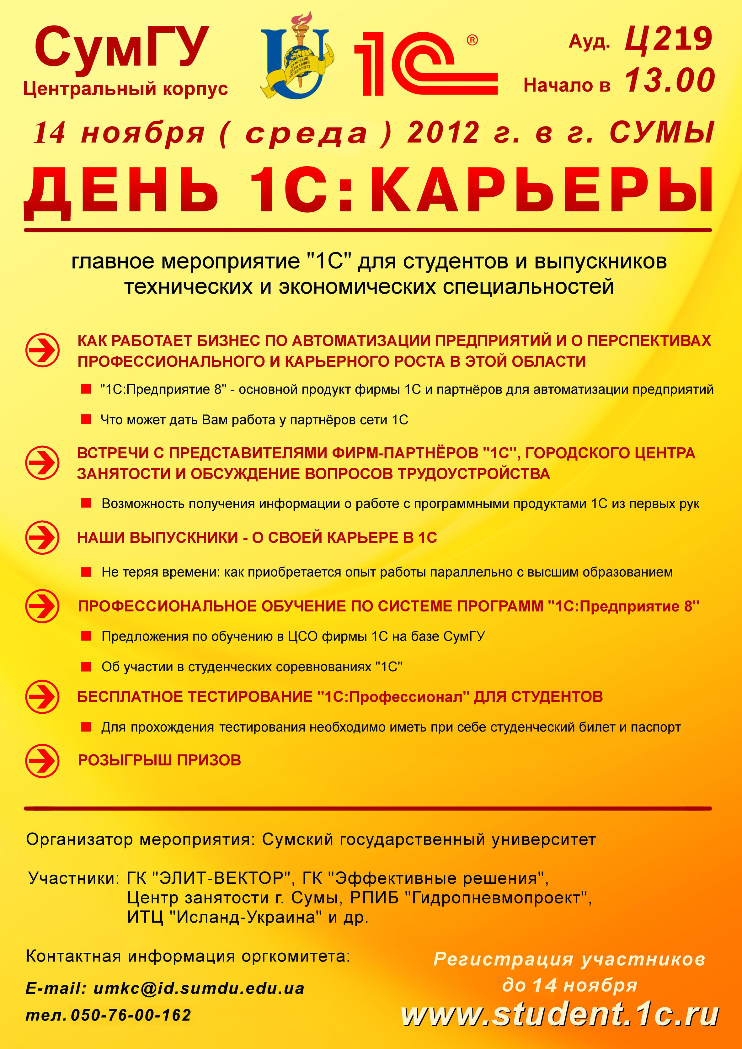Приглашаем на День 1С:Карьеры в СумГУ 14 ноября (среда) в 13 часов, ауд. Ц 219