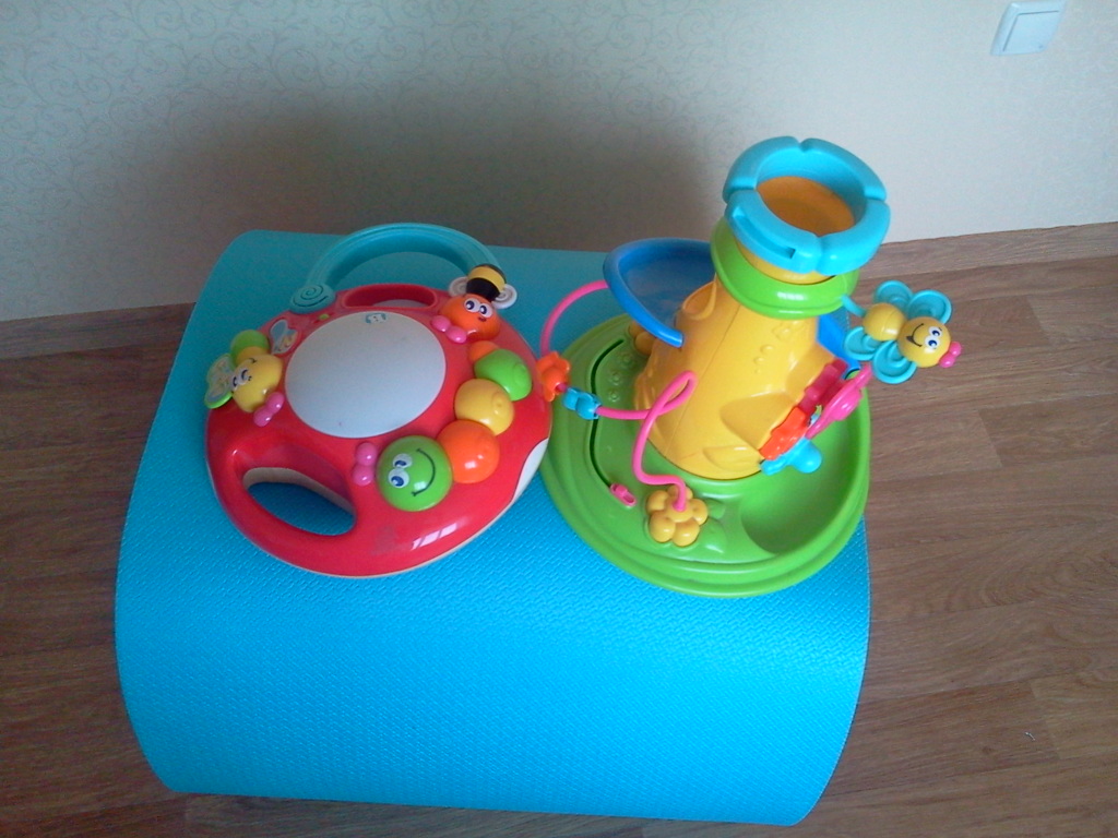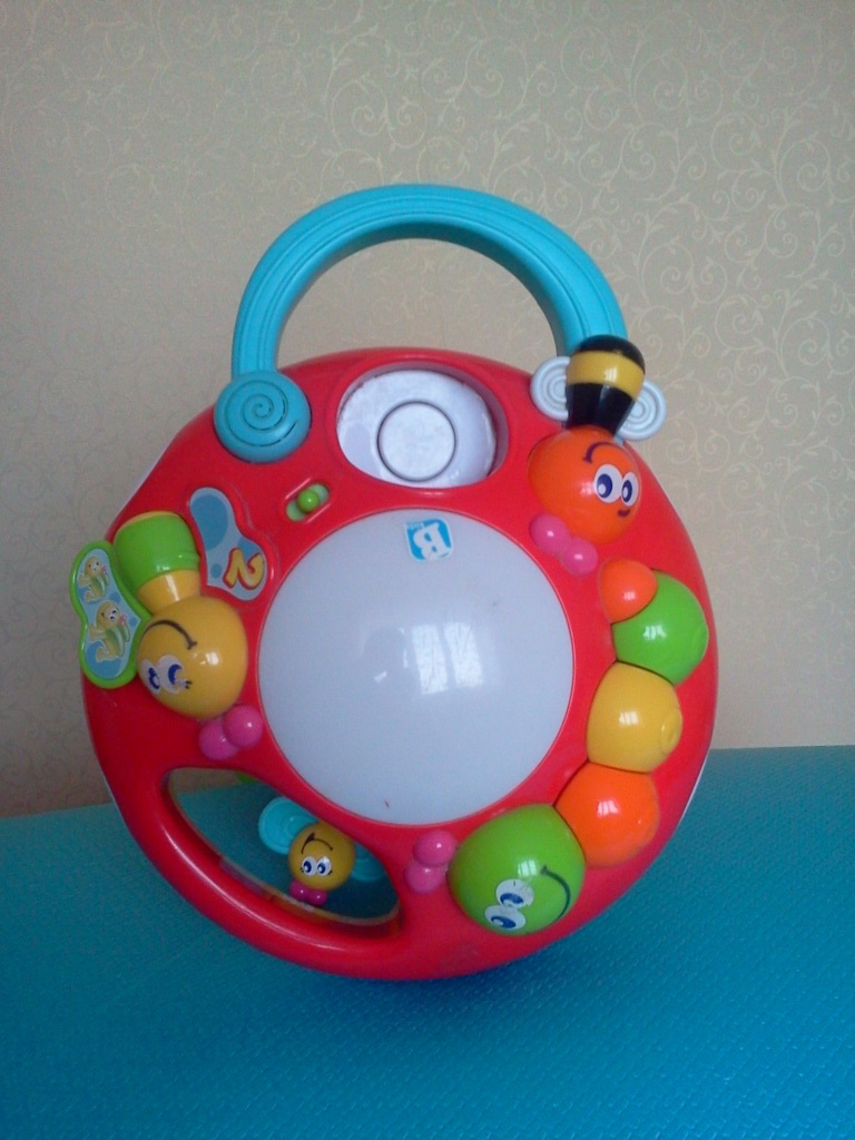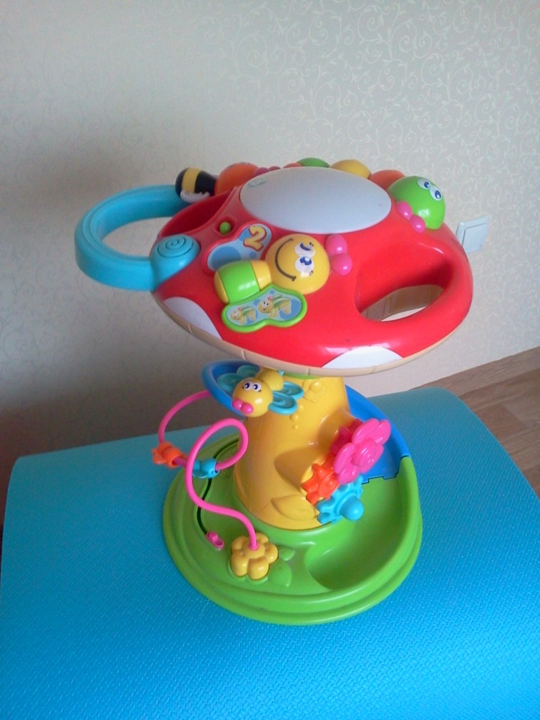 Музыкальный грибок с множеством красивых разноцветных кнопочек, бабочек и мелодий. Внутри спиральный желобок, куда ребенок должен забрасывать мячики, которые скатываются по нему вниз. Верхушка снимается и может быть самостоятельной игрушкой. Нашему ребенку было интересно играть уже месяцев с 6. В общем игрушка очень прикольная. Состояние на 5 с минусом. Работает на 2х пальчиковых батарейках, при чем хватает их очень на долго, а звук замечательный. Производитель "B-kids".