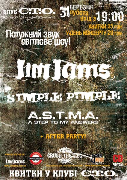 В этот вечер играют сумские команды: Jim Jams, Simple Pimple и впервые на сцене A.S.T.M.A. (A Step To My Answers), по финалу - AFTER PARTY для самых стойких!