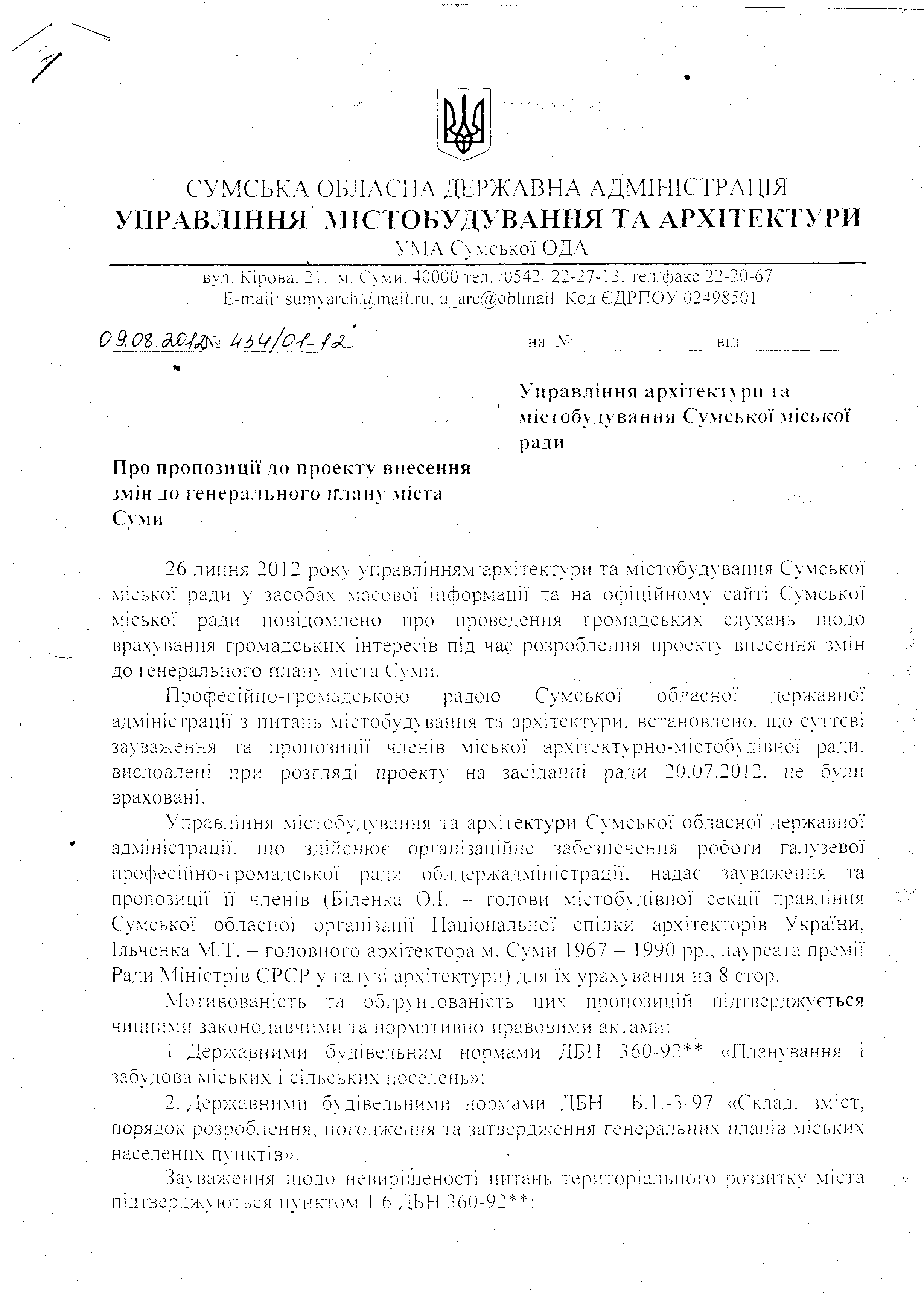 Теперь предметно о зеленых зонах. Я выложил скан предложений к генплану, подписанный архитектором области, которой мне передал лично адвокат В. Моисеенко, где идет речь о маштабном сокращении зеленых зон. О том, что зеленые и рекреационные зоны сокращены в 2 раза написала областная архитектура и лично подписал архитектор области, а также писал почетный архитектор Сум Н. Ильченко, областной союз архитекторов. Это они безграмотные или Вы которые вряди даже читали пояснительные записки к генплану и плану зонирования, не то, что в графическую часть потрудились посмотреть.