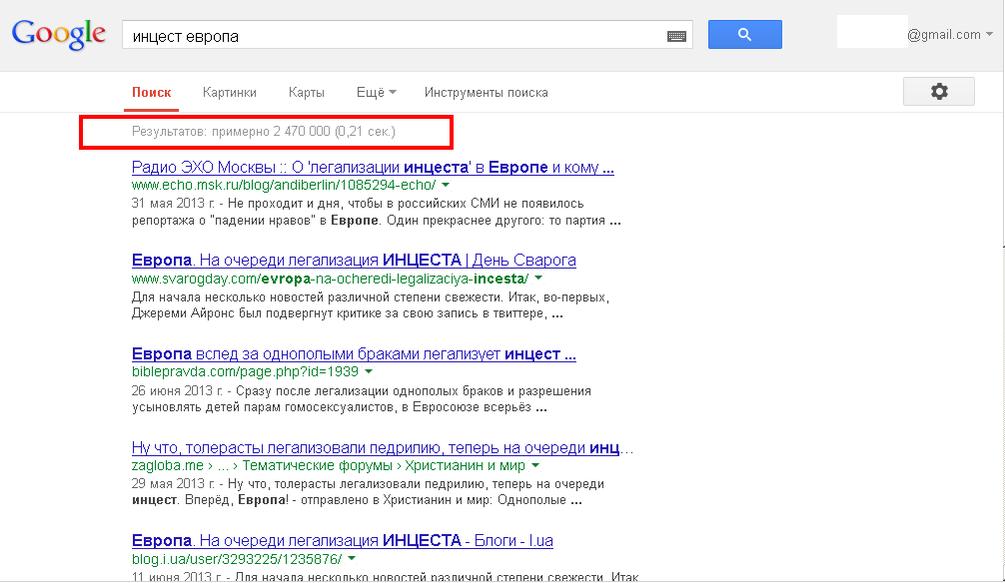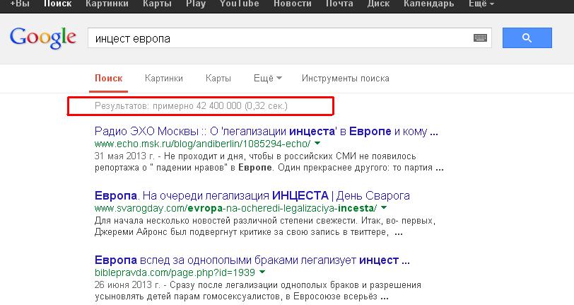 Причем поиск "инцест россия" показывает миллион, но в Европе 733 млн жителей а в РФии 140 (не помню точно) но сути не меняетРезультатов: примерно 2 420 000 (0,32 сек.)