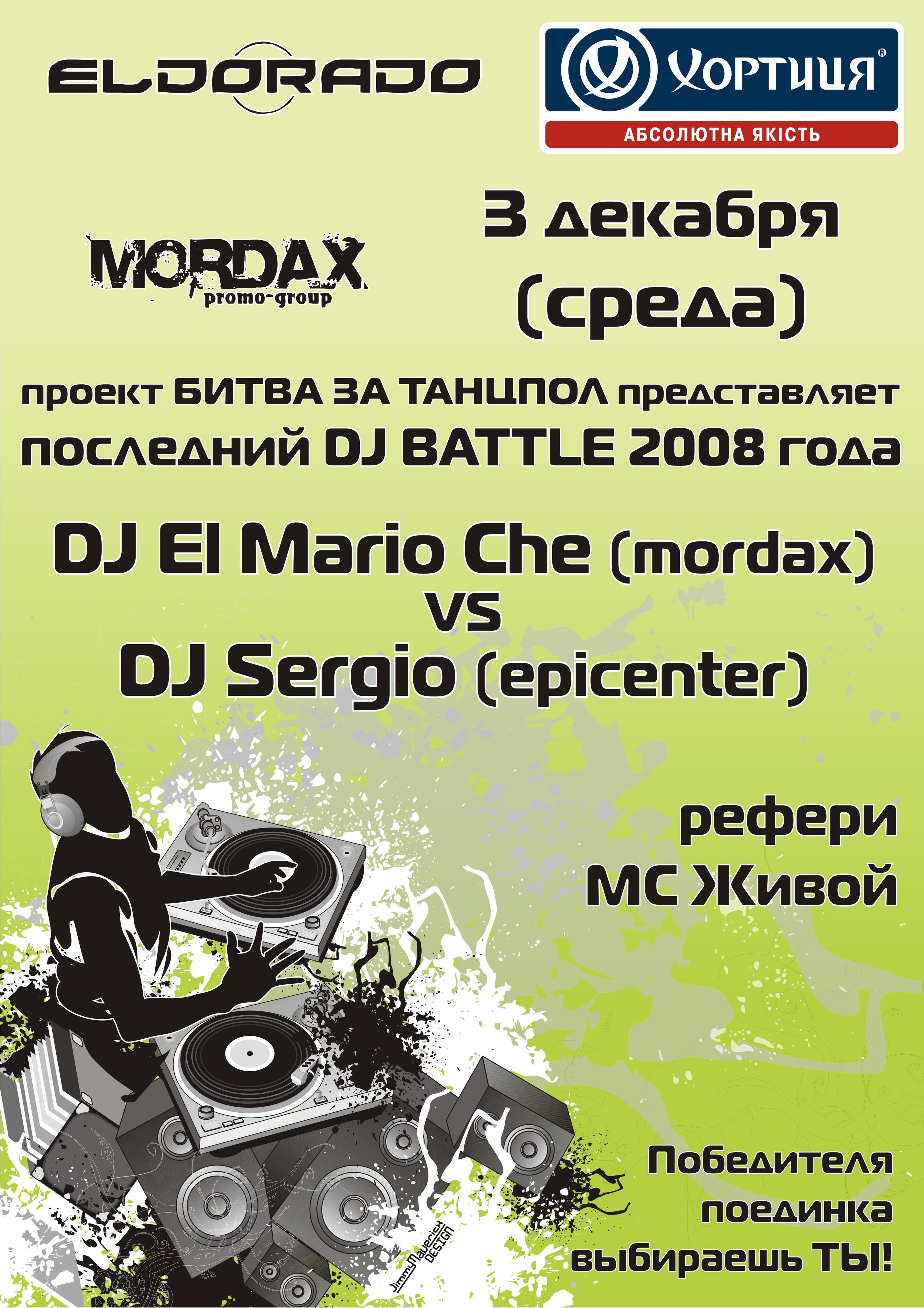 3 декабря(среда), нк Эльдорадо & Mordax promo-group и проэкт БИТВА ЗА ТАНЦПОЛ представляет: Последний DJ BATTLE 2008 ГОДА Dj Sergio vs Dj El Mario Che.Рефери Mc Zhivou