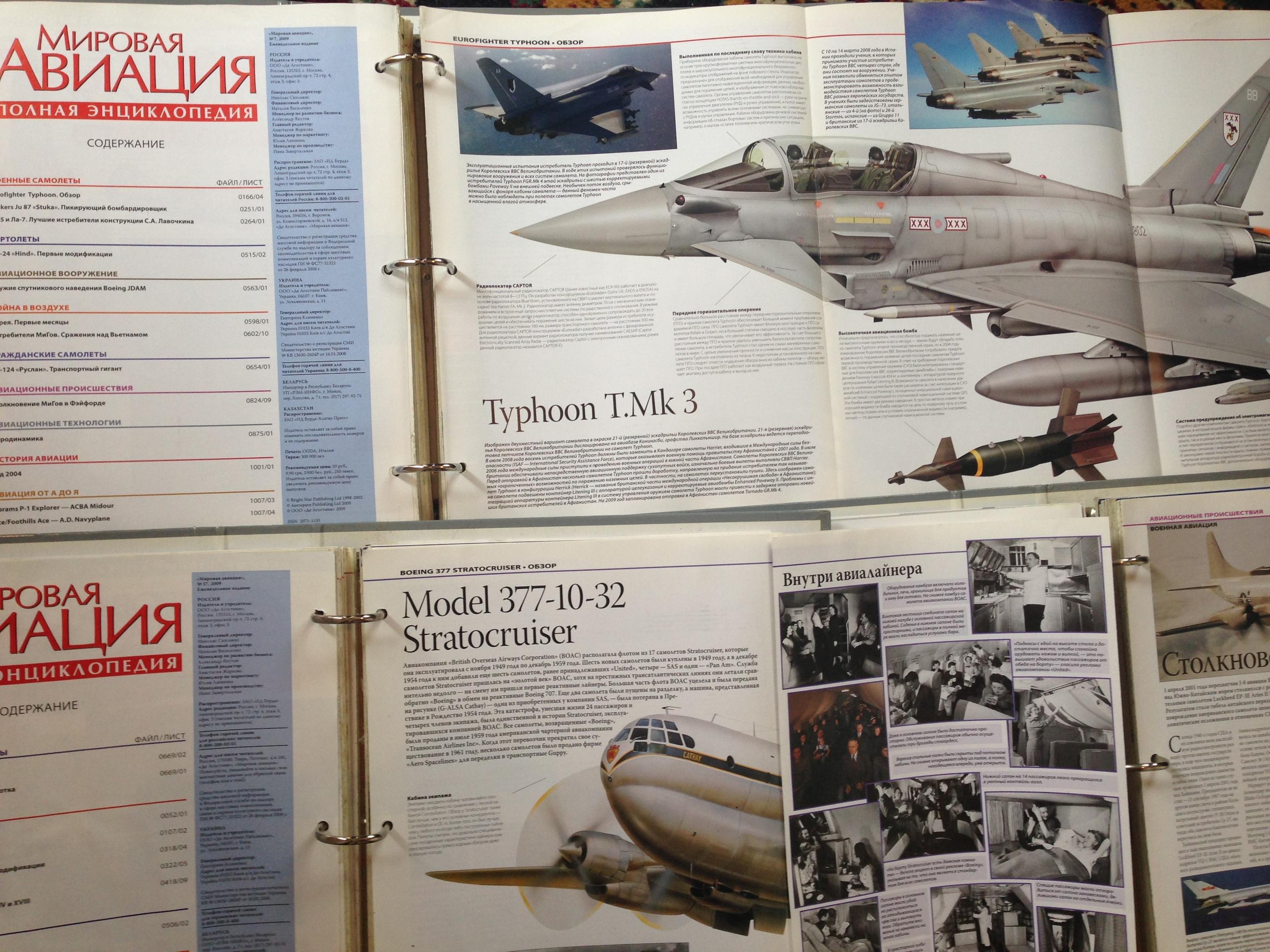 В каждом выпуске по военному и гражданскому авиасудну, подробная схема одного из них, краткий обзор авиатранспорта за определенный период времени и многое другое (См фото с оглавлением выпусков)