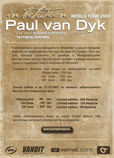 Kosheen, Christopher Lawrence, Yoji Biomehanika и Johan Gielenплюс где-то наверное в осенью, состоится Киев Денс 4, на котором два года назад жгли абовы, шульц, ван дорн, пока инфы кто и что нету, но у меня есть знакомый который как-то там связан с организаторами, как только он появится постараюсь все разузнать. Было бы классно если как-то приурочили тур Паши, и этот фест, что бы все это растянулось на пару дней... Но врядле такое будет (