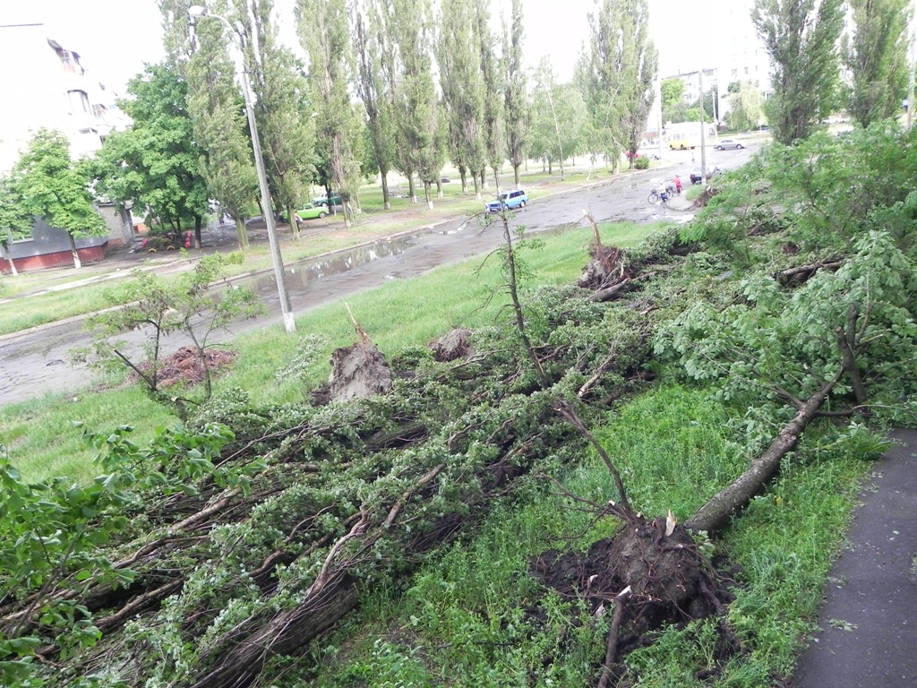 Проезжал сегодня утром по дворам на пр.Лушпы. Очень много поваленых деревьев, оборваны провода. Возле 17 школы 3 тополя перегородили внутридворовые проезды. Возле ПриватБанка лежит чья та крыша жестяная скомканая в шар высотой под 3 метра, на островке возле ТНК заправки лежат все бигборды, на территории Сельпо тоже упал бигборд. На Харьковской возле Выставочного повалило даже маленькие деревца высотой 2-3 метра.