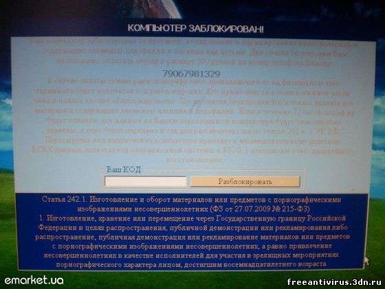 Разблокировка Вашего ПК после атаки вируса требующего отправлять смс или деньги (как показано на рис.)