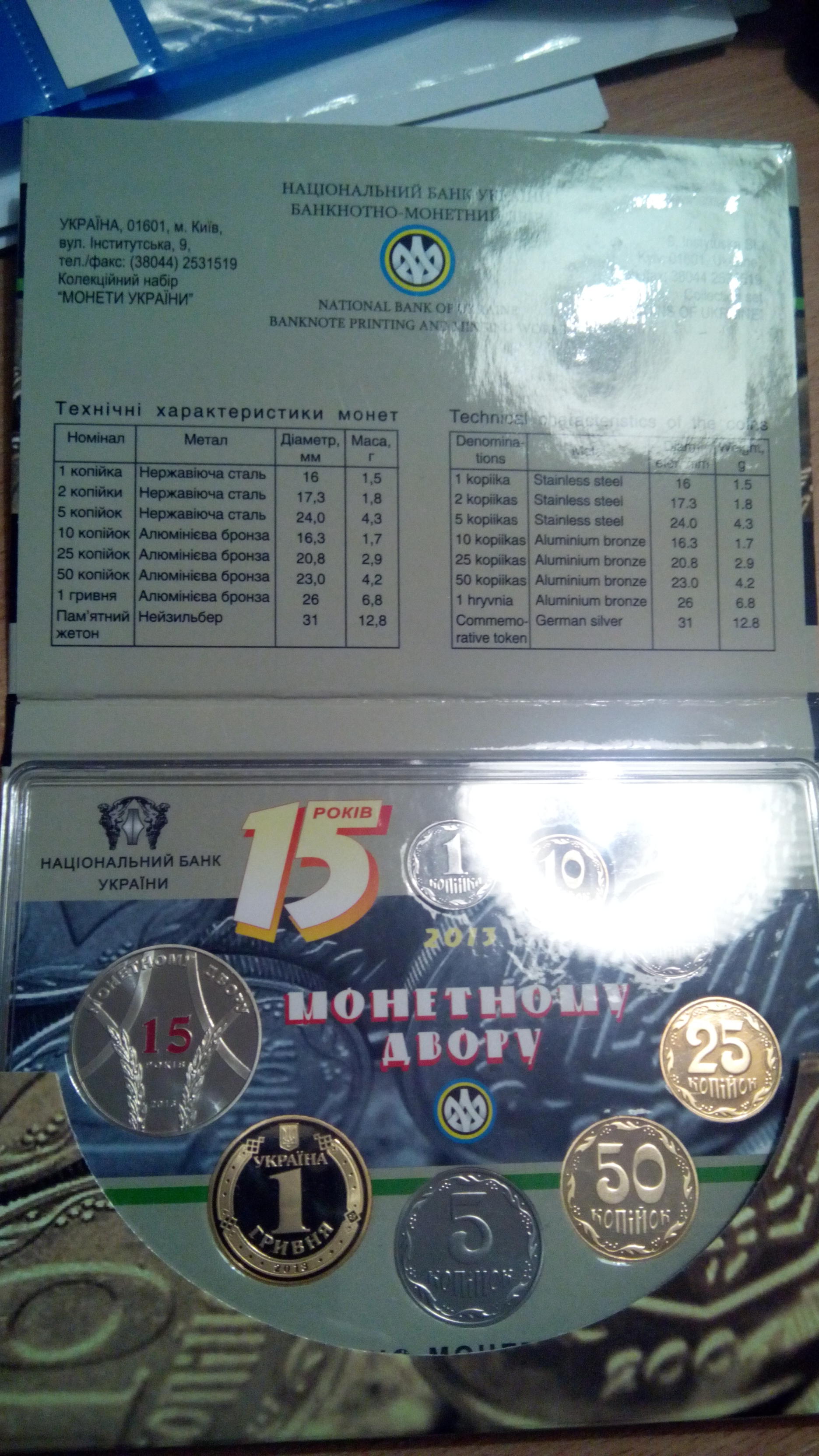 У набір увійшли випущені в покращеній якості розмінні монети усіх номіналів: 1, 2, 5 копійок (Акмонітал; згідно характеристики НБУ - нержавіюча сталь), 10, 25, 50 копійок, обігова монета номіналом 1 гривня (алюмінієва бронза), а також випущений з нейзильберу пам'ятний жетон «15 років Монетному двору НБУ». Жетон виконаний з використанням кольорової емалі.