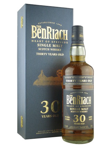 Виски BenRiach 30 Years Old (Бенриах 30 лет) – эксклюзивный напиток, он был выпущен ограниченным тиражом – всего три тысячи бутылок. Виски Бенриах 30 лет обладает сладковато – пряным ароматом, с оттенками черного шоколада, ванили, хереса, меда и изюма. Вкус напитка подарит Вам сочетание цитрусовых ноток с шоколадными и пряными тонами.