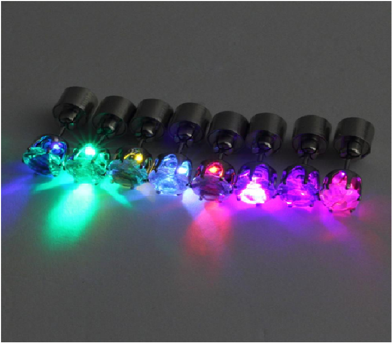 Светодиодные серьги-гвоздики подходят для вечеринок а также дискотек, еще их можно носить не включая, с обычными силиконовыми зажимами. Корпус серебристый, цвет - мультиколор( мигает разными цветами и разными режимами, батарейка в комплекте)
