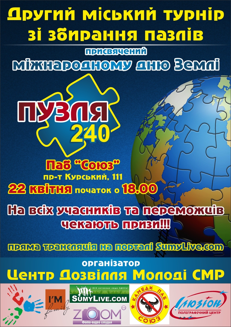 У вівторок 22 квітня 2014 року о 18.00 "Сумський міський центр дозвілля молоді" Сумської міської ради проводить ІІ-й міський турнір зі швидкісного збирання пазлів – «Пузля-240».