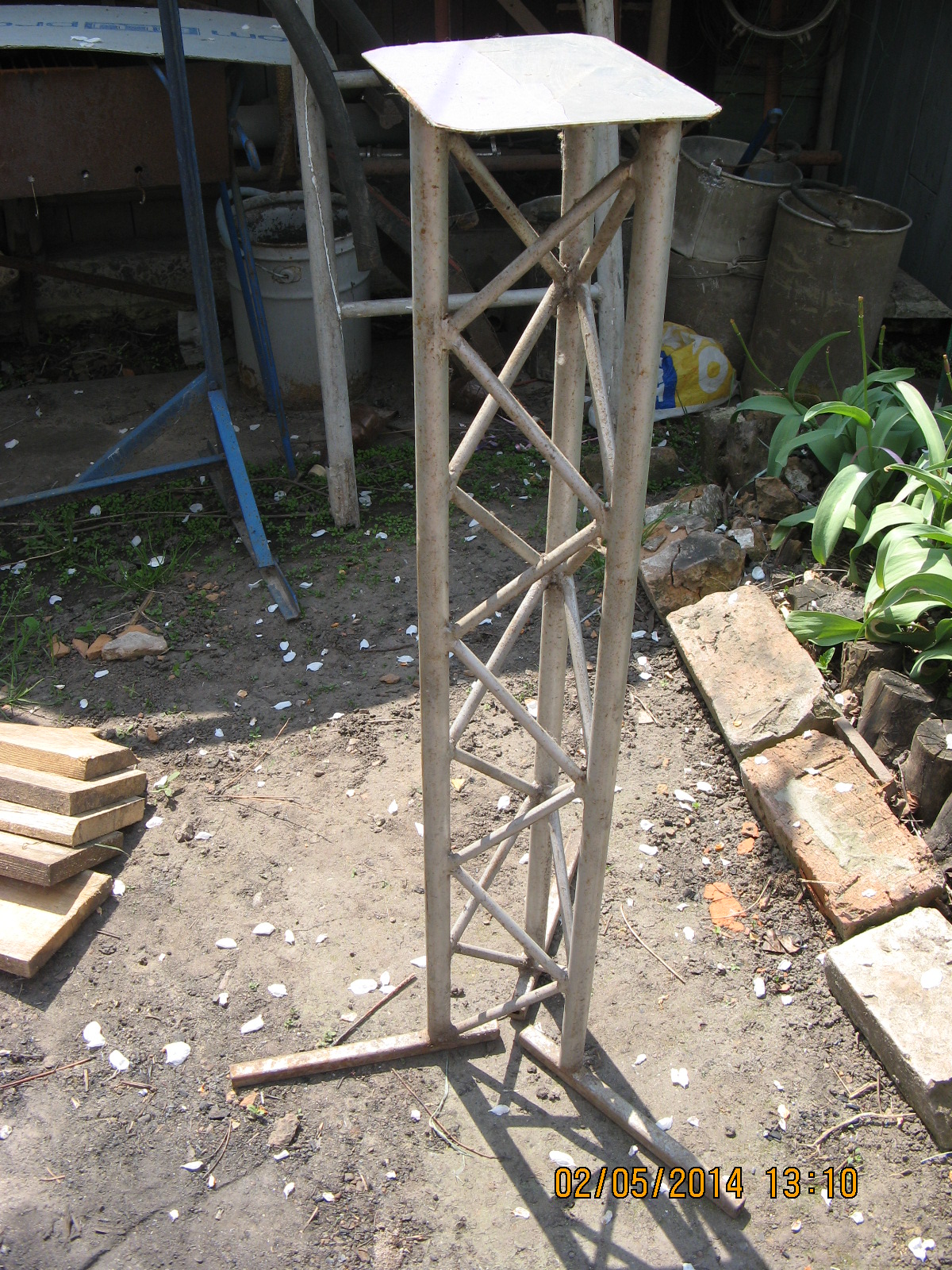 верхняя площадка 155ммх200мм толщина 2мм, внизу труба 15х15 (длина 255мм), само тело труба 15мм, стержни 10мм, высота конструкции 880мм