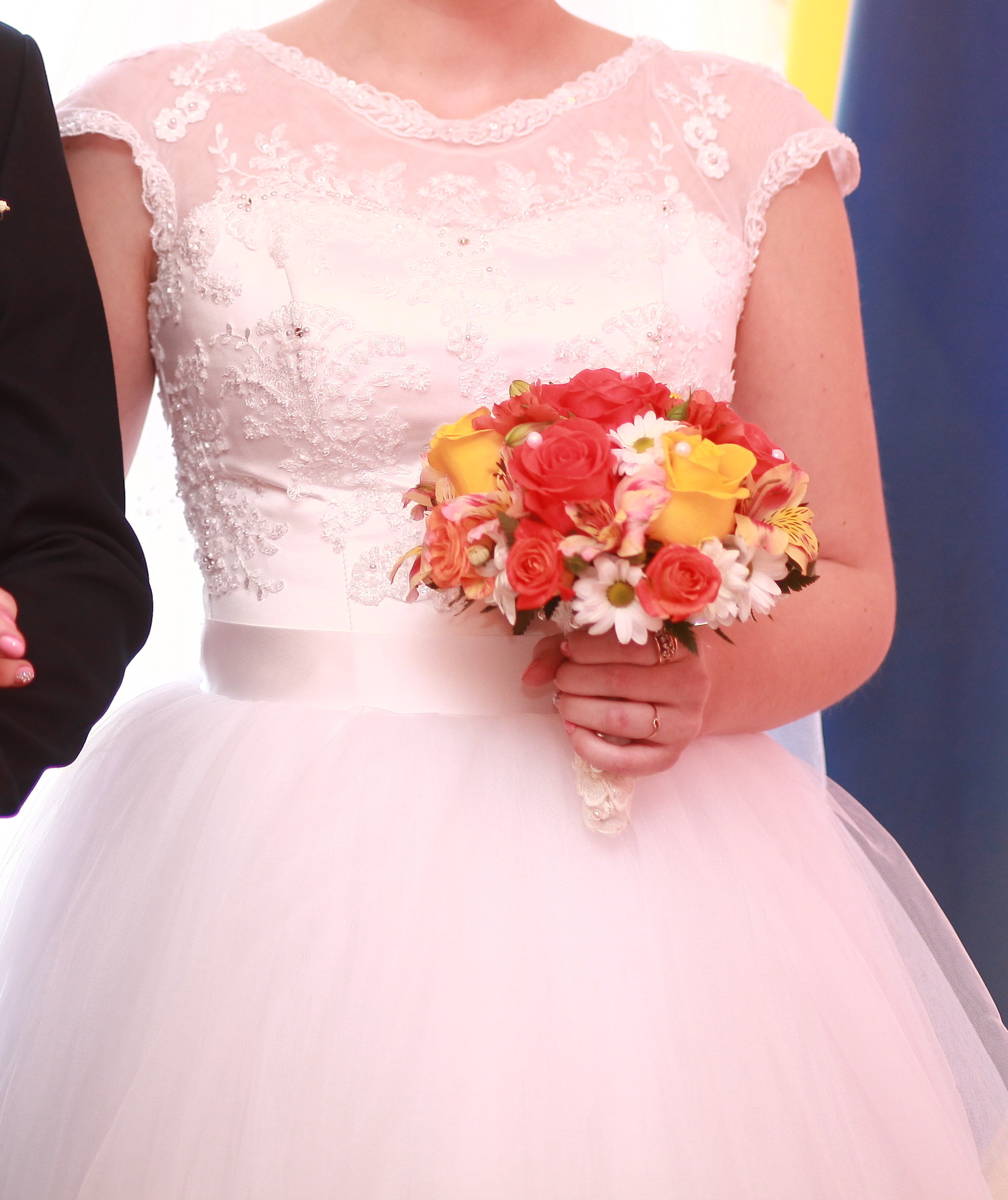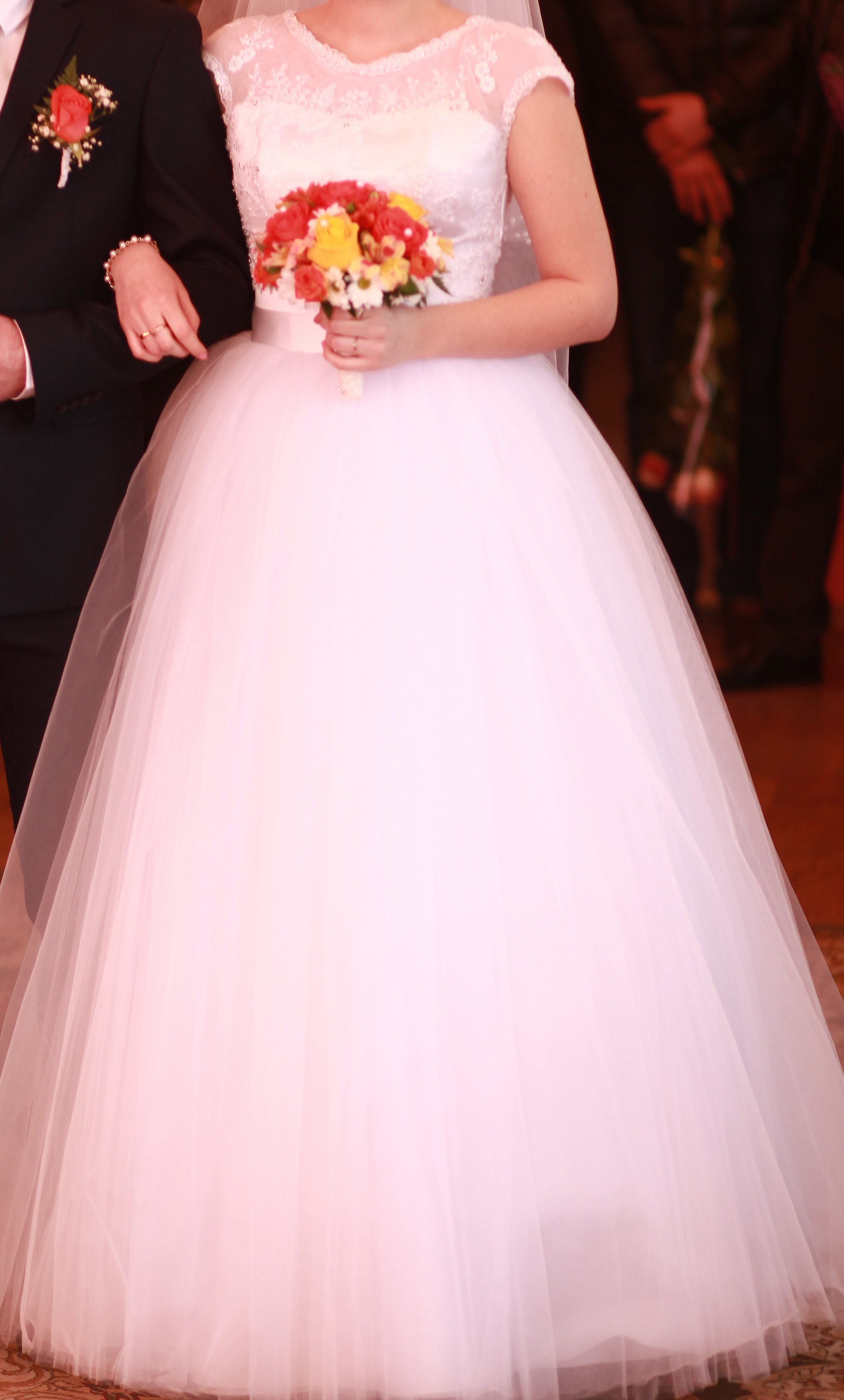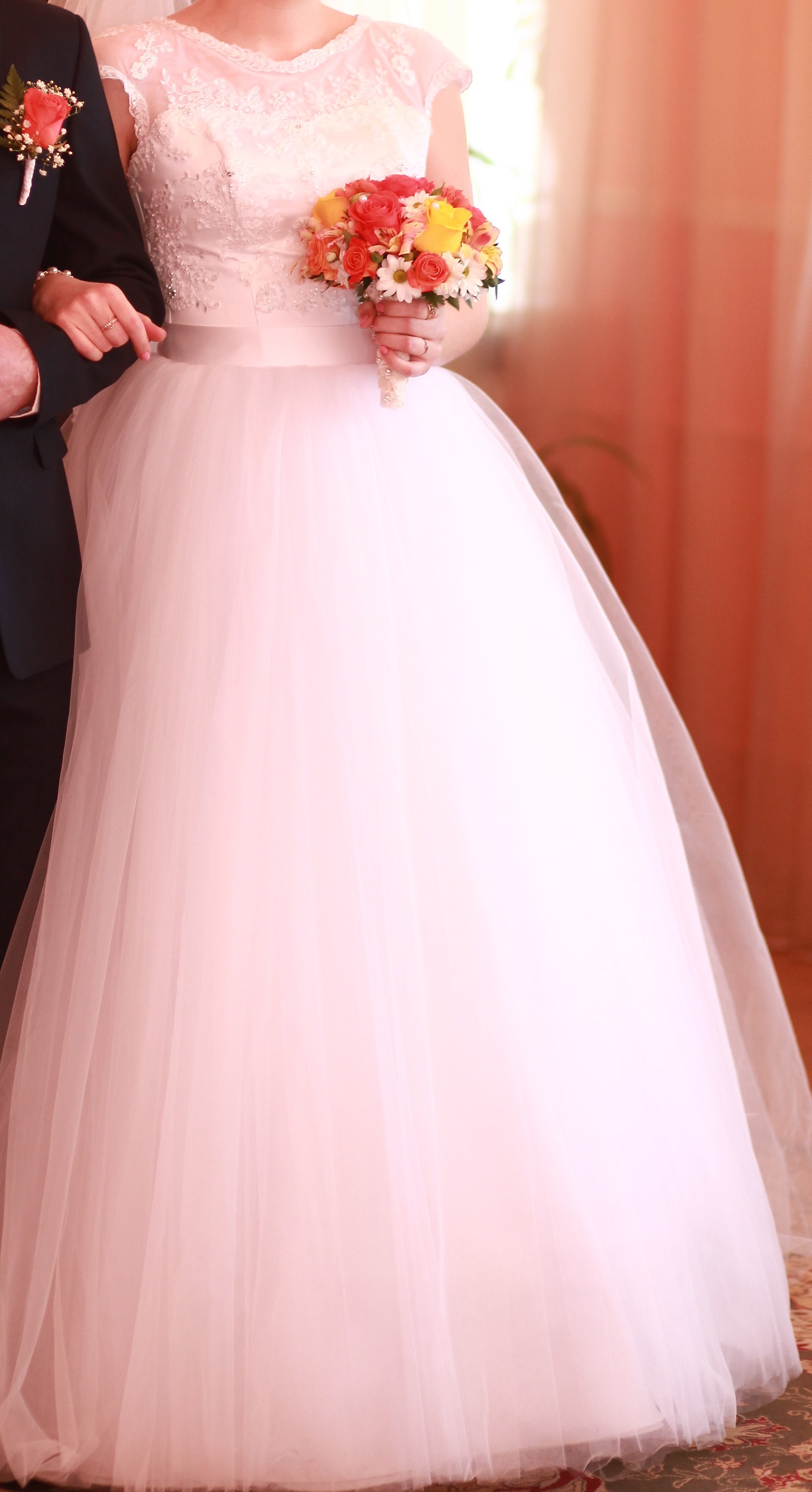Девочки!!! Очень красивое и нежное свадебное платье! Б/у 1 раз, состояние отличное! Платье 46 размера, на рост примерно 165-170 см. Сзади корсет регулируется, пышное от талии (!), модель 2014 года. Верх вышит бисером и жемчужинками, выглядит изысканно и дорого.