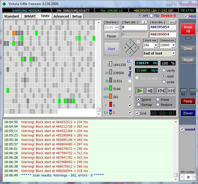 Здравствуйте. У меня возник вопрос. Уже долгое время компьютер стал тормозить. То есть при запуске программы или просто щелчке по ярлыку или папке компьютер задумчиво впадает в сон на пару секунд... и при этом мигает красная лампочка на системнике и создается характерный шуршащий звук от винта. Я раз в неделю делаю дефрагментацию диска и иногда это спасало положение, но ненадолго. Вчера установил програмку Victoria, которая диагностирует HDD. Провел тест и выдало мне вот какие данные... Что по этому скрину можно сказать о состоянии винта? Он годный или ему конец?