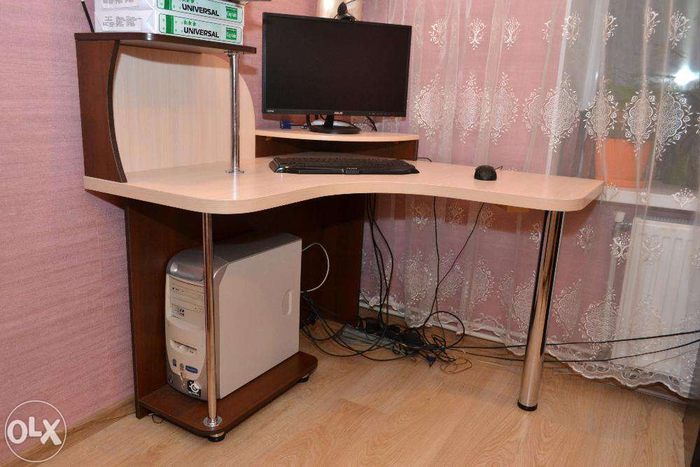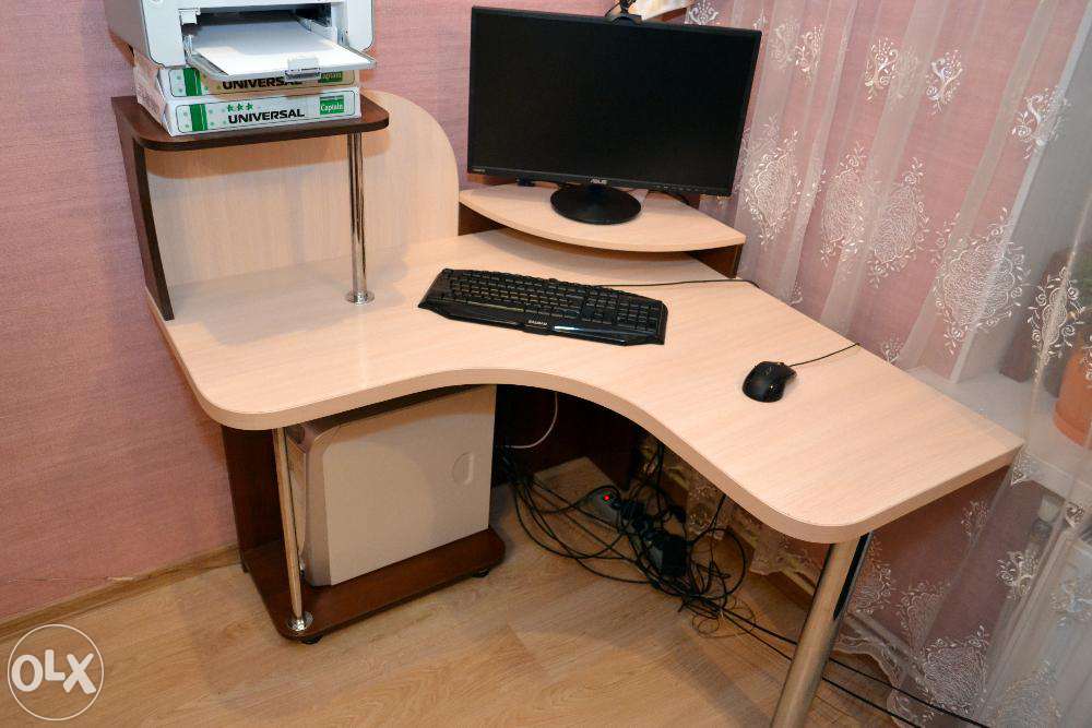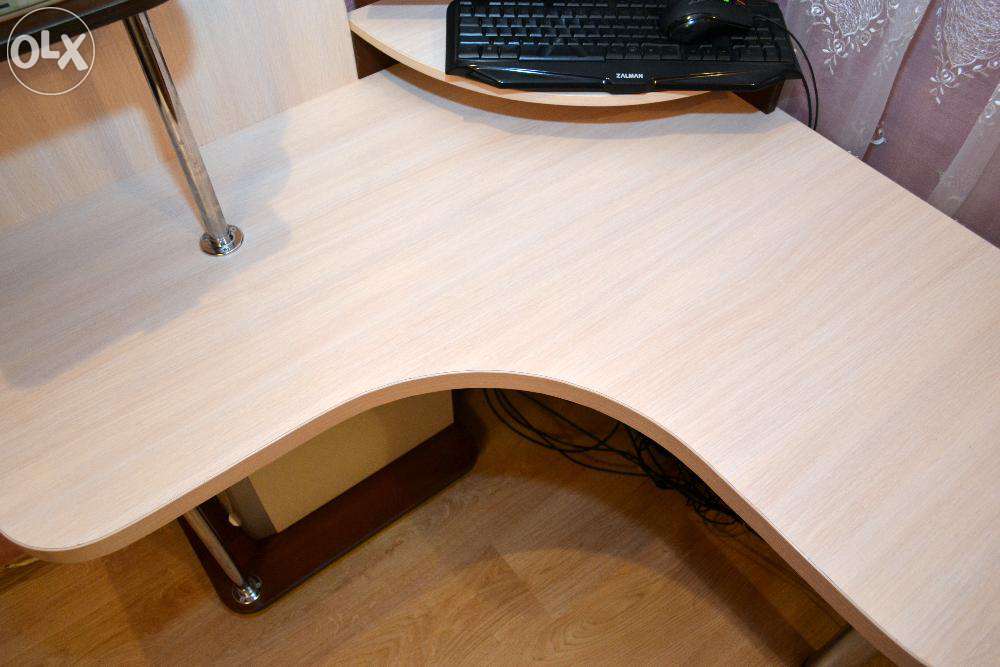 Продам угловой стол в идеальном состоянии собранный по индивидуальному заказу с привлечением профессионального дизайнера. Б/у около 8 месяцев! На фото выдвижная полка под клавиатуру снята - она идет в комплекте и ее легко поставить/снять. + Покупателю в подарок НОВЫЕ направляющие и крепления для выдвижной полки под клавиатуру в комплекте.