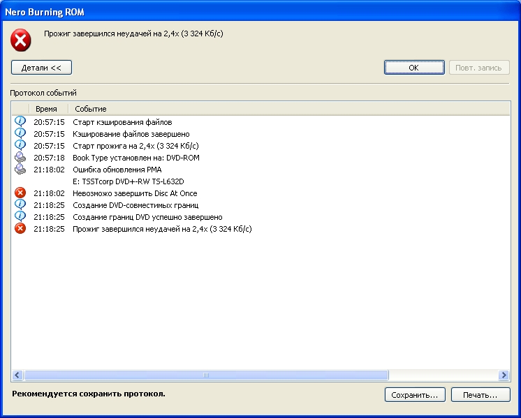 Пишу как всегда при помощи Неро 7. Последние две записи закончились неудачей, скриншот и лог прилагаю... Может кто обьяснит что за фигня?