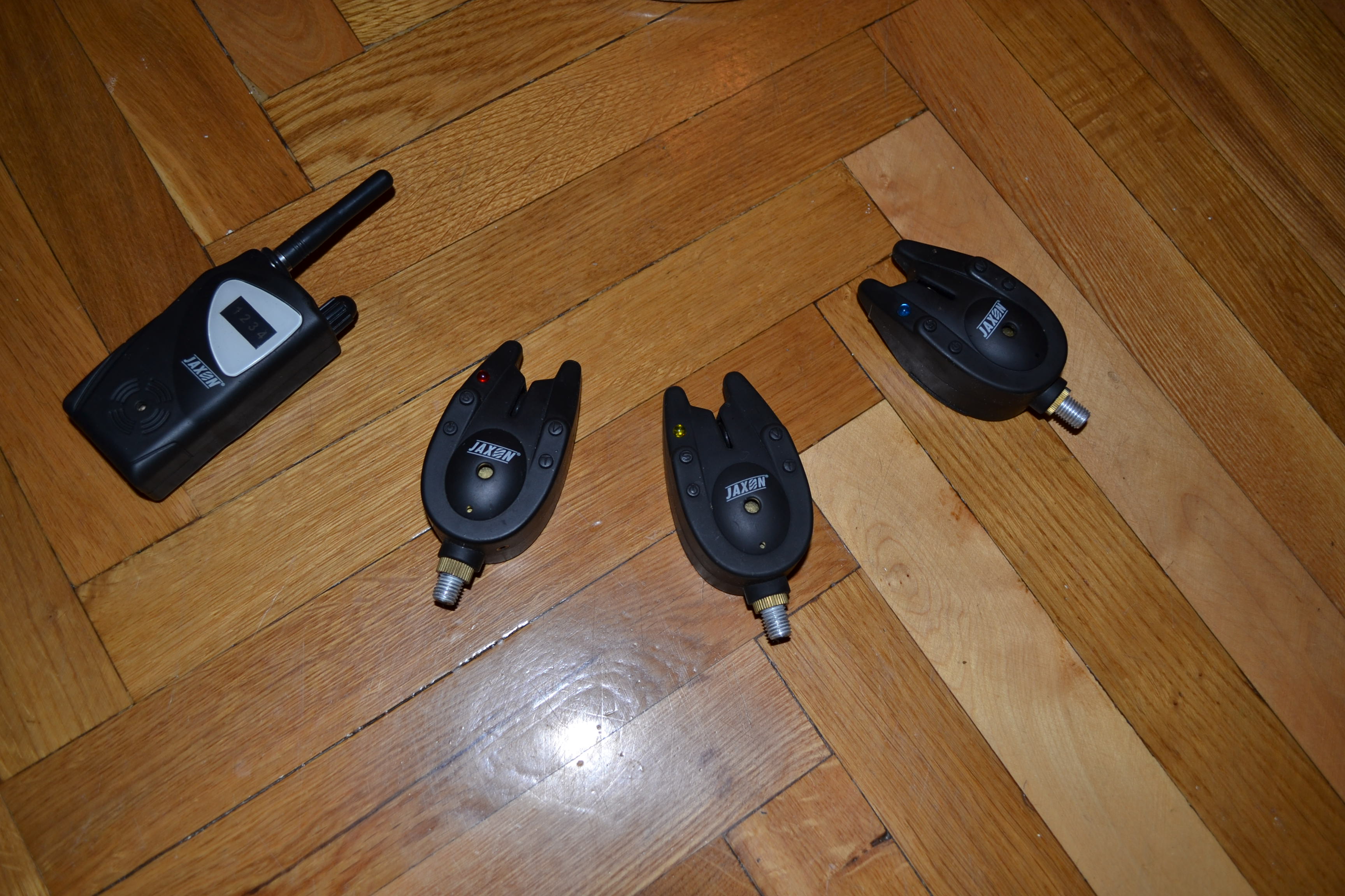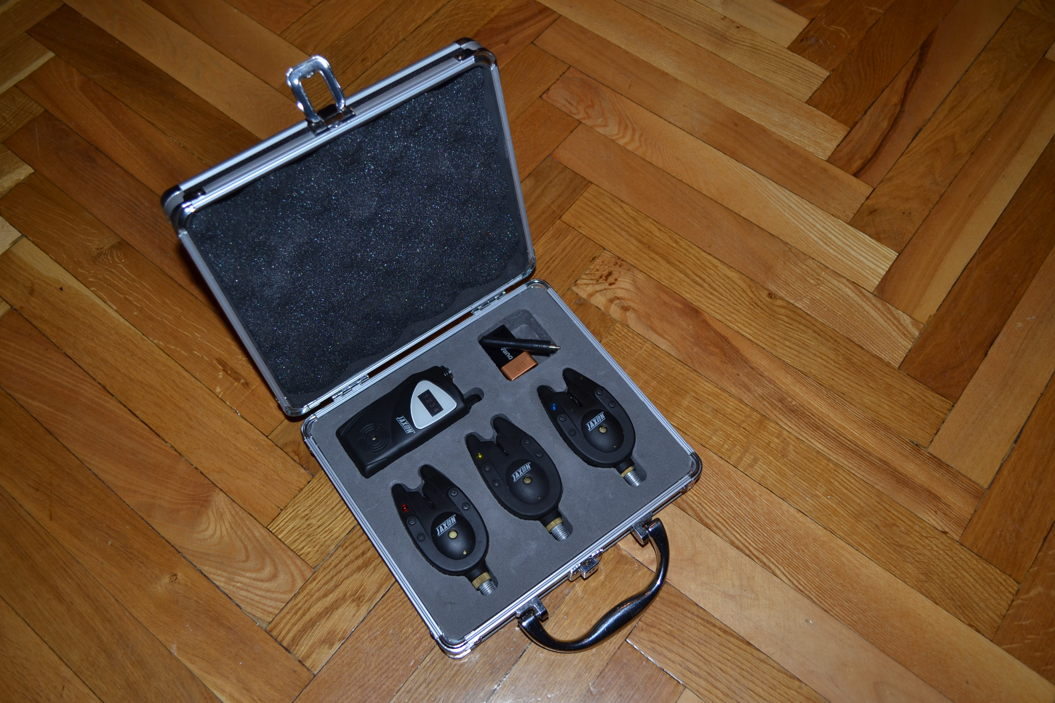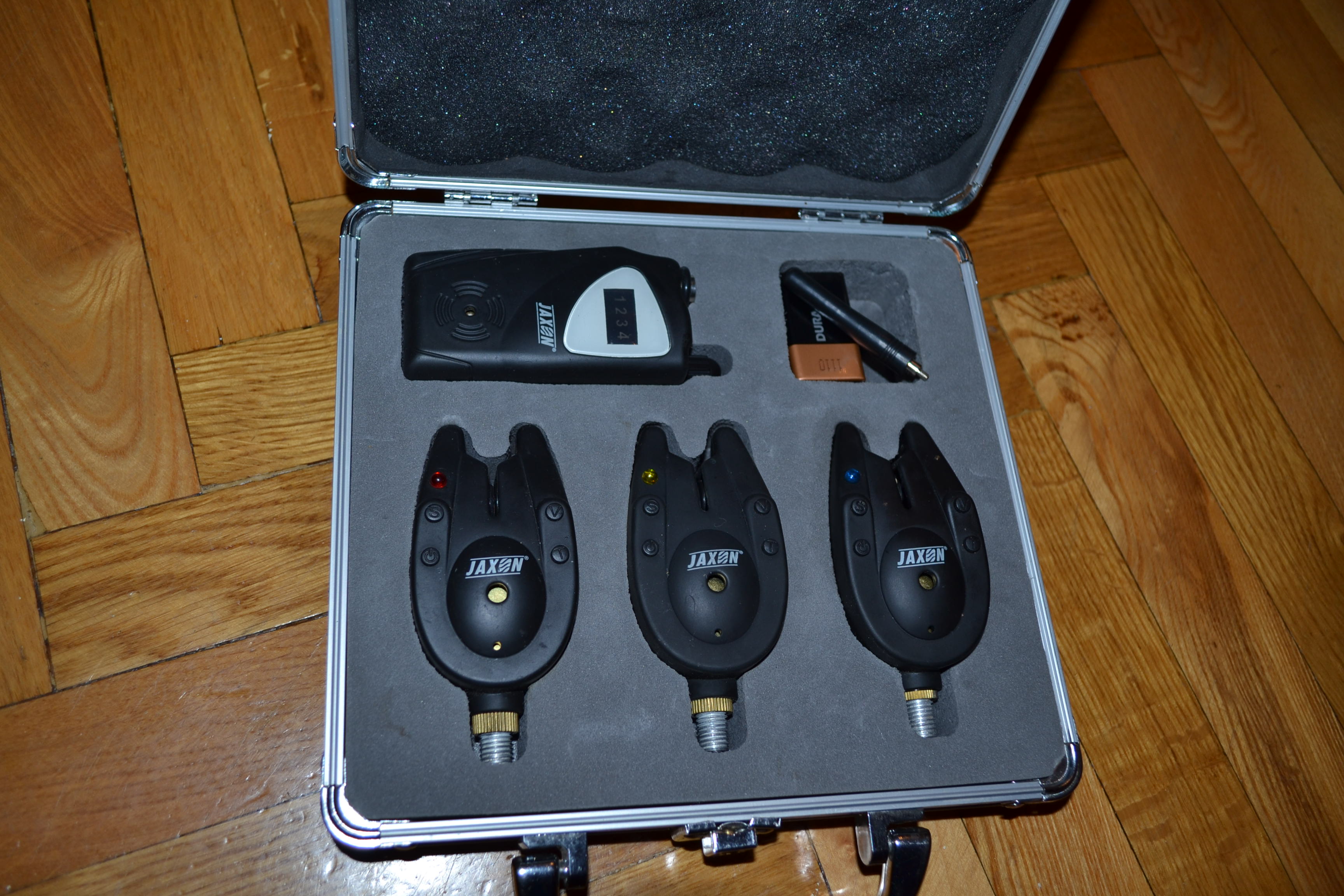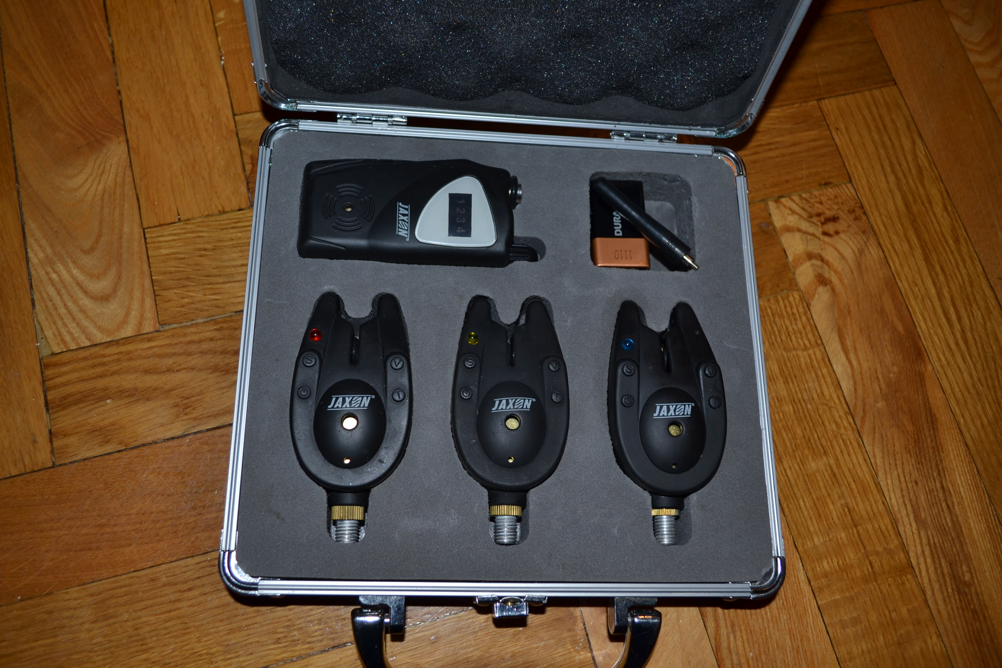Три навороченных радио сигнализатора поклевки Jaxon и пейджер в кейсе. для рыбалки Современные электронные сигнализаторы отличного качества польской фирмы Jaxon. В комплекте 3 сигнализатора и пейджер для контроля за поклёвками на расстоянии. Сигнализаторы имеют функцию "обучения срабатывания на поклёвку" - IQ.