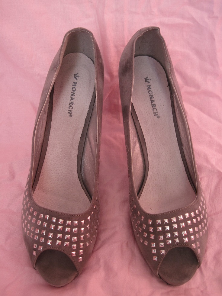 Туфельки модельные, серые из искусственной замши и металлическими заклепками в превосходном состоянии, одевались пару раз. Торговая марка MONARCH, р. 40 длина по стельке-26,5см, платформа -1,5см, высота каблука -10см. ЦЕНА - 100 грн