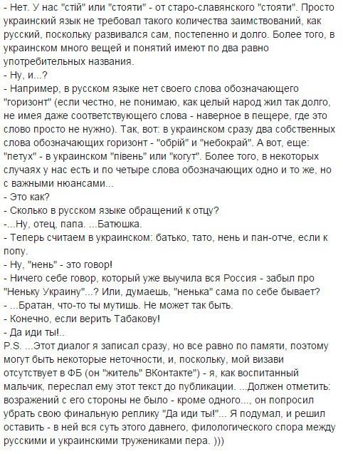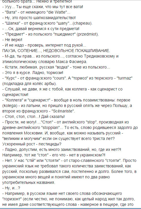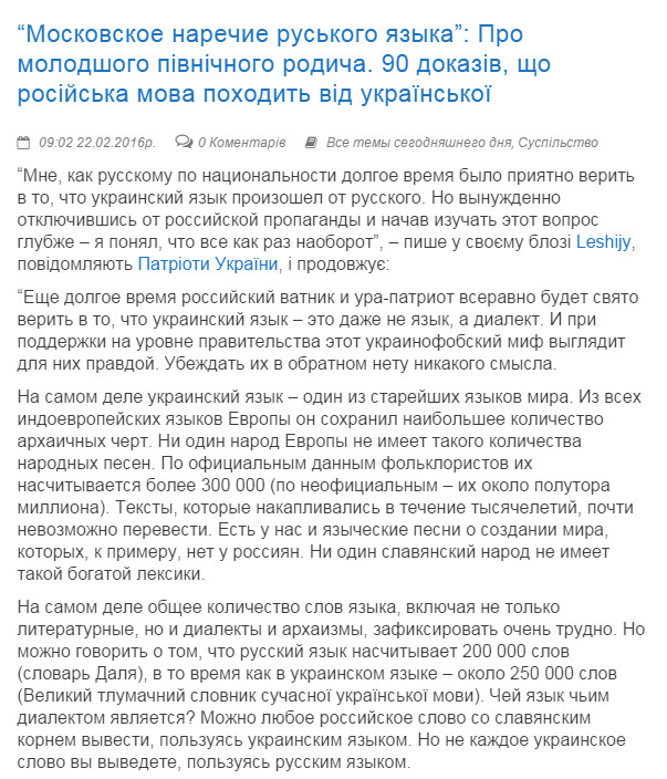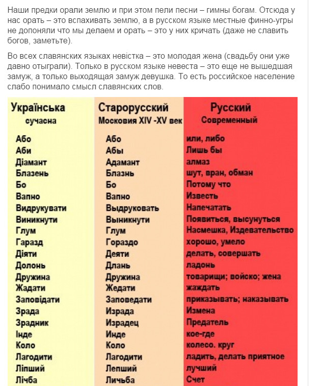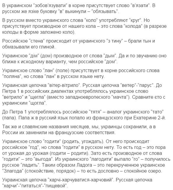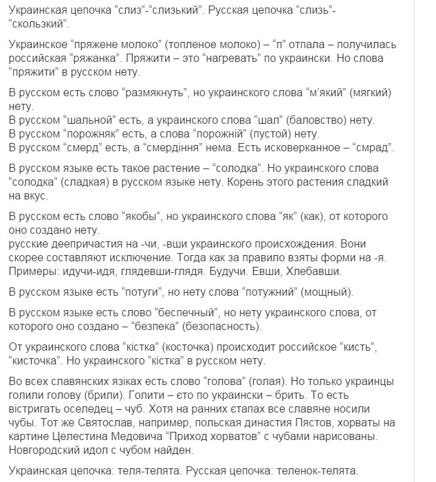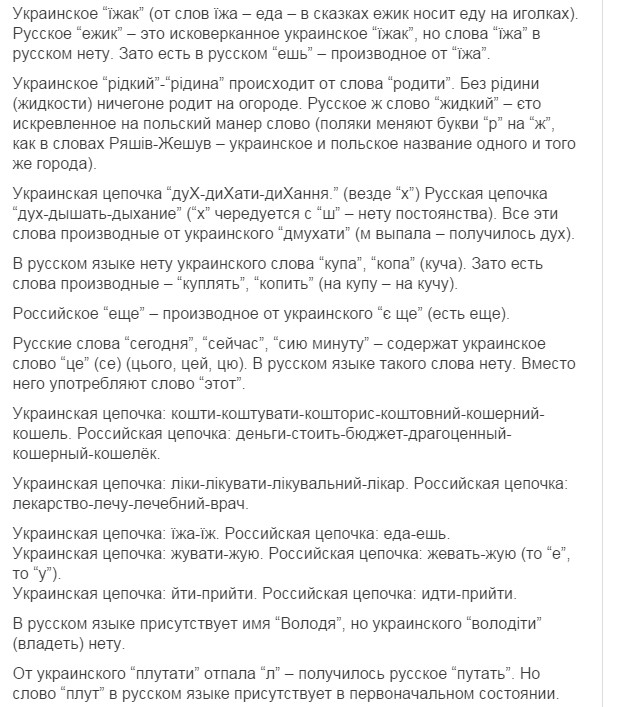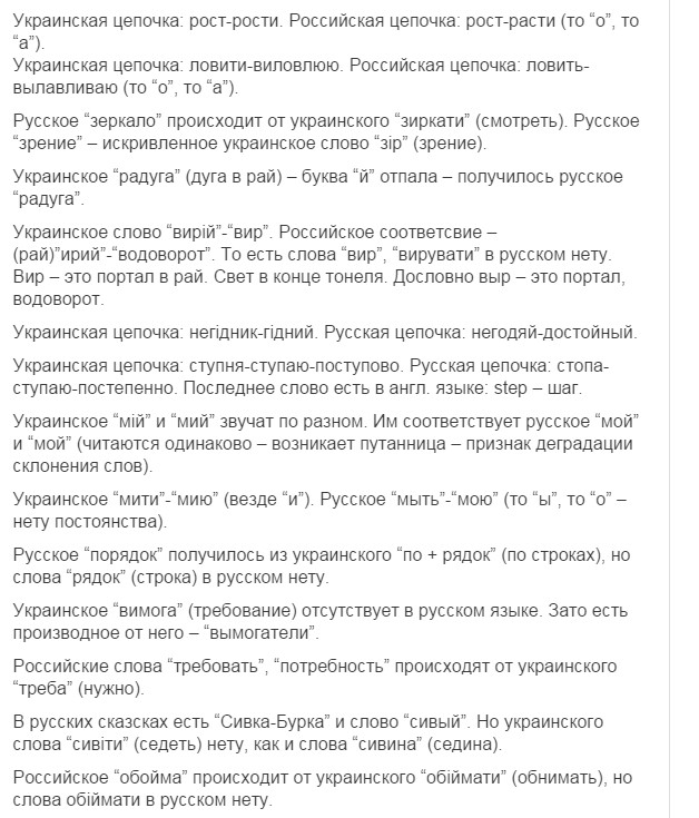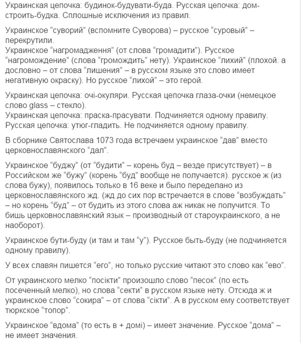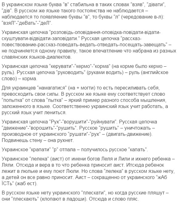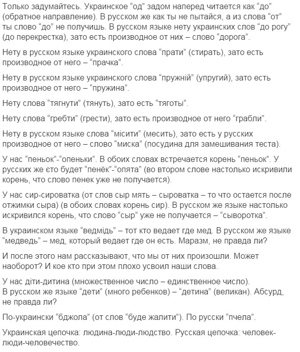 нууууу... это типа задорнова про Ра опусы, только вышыватные. Потому что я в школе учил дойче шпрахе, и там слово костет (читается как кОcтет) очен похоже на наше коштувать. Ви филь костет дас (дизе)... (сколько стоит этот...) wieviel kostet das ist schmutzige cotton - сколько стоит эта грязная вата =) Но факт окстается фактом - наш язык на 80% по лексике совпадает с беларусским, на 60 и более с болгарским, польским, сербским и другими славянскими языками. Угрофинскомонголославянскый эзыг - на 40 (или около того). И как наш язык от ихнего мог пойти? Это как 146% - математика даунито хромосомо.