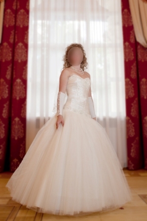 Продаю свадебное платье, размер 42-44 (регулируется шнуровкой на корсете), рост - 175 см (с каблуками), в отличном состоянии, пышное, цвет "шампань". Юбка на 4е кольца прилагается.