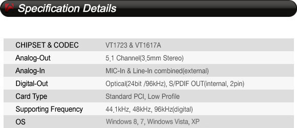 Звук.РСI карта, вх. MIC In, Line In., вых. 5.1 Channels (G9 to 3Phone Jack),Циф.вых: Optical & Coaxial.,Поддержка EAX 1.0/2.0, A3D, DirectSound 3D,Поддерживаемые ОС Windows 98SE, ME, 2000, XP, 2003 , XP WHQL driver.