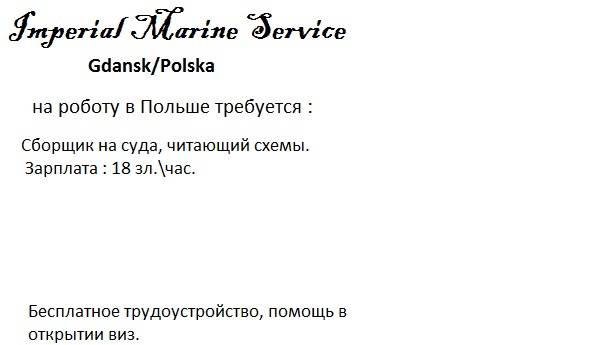 IMPERIAL MARINE SERVICE НАБИРАЕТ НА РОБОТУ.
