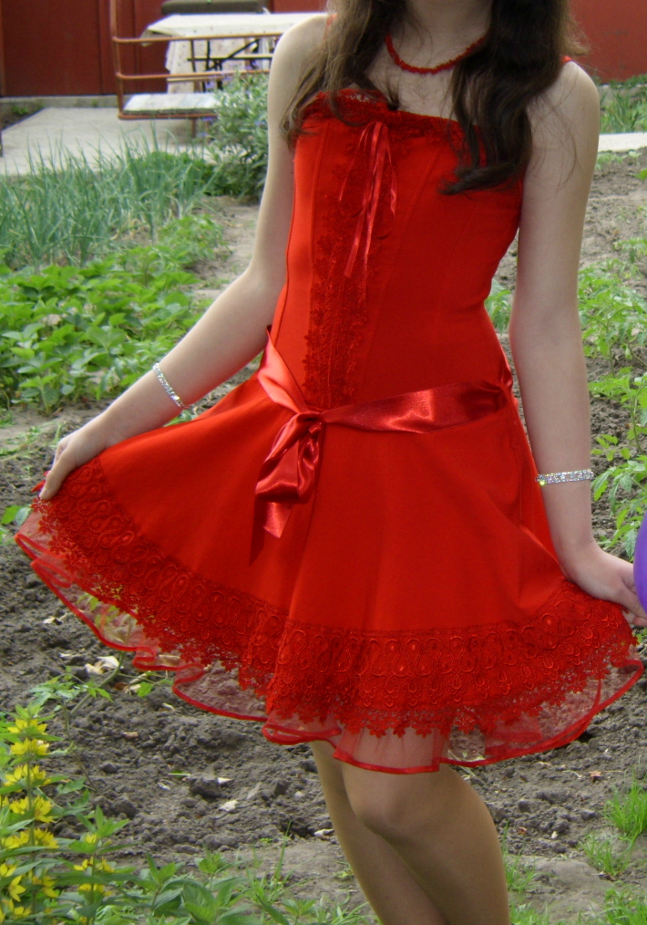 Размер 38. Хорошо садится на любой тип фигуры и подчеркивает ее благодаря корсету на резинке. Длина до колен.