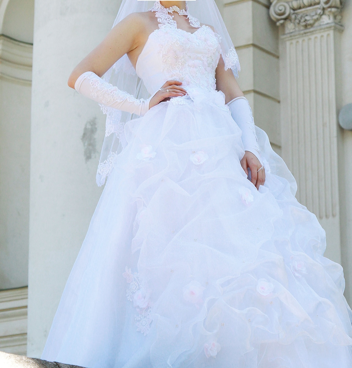 Продам свадебное платье. Размер 46-48. Цвет - белый с бледно-розовыми вставками и перчатками (кольца есть). Цена 3000 грн торг.