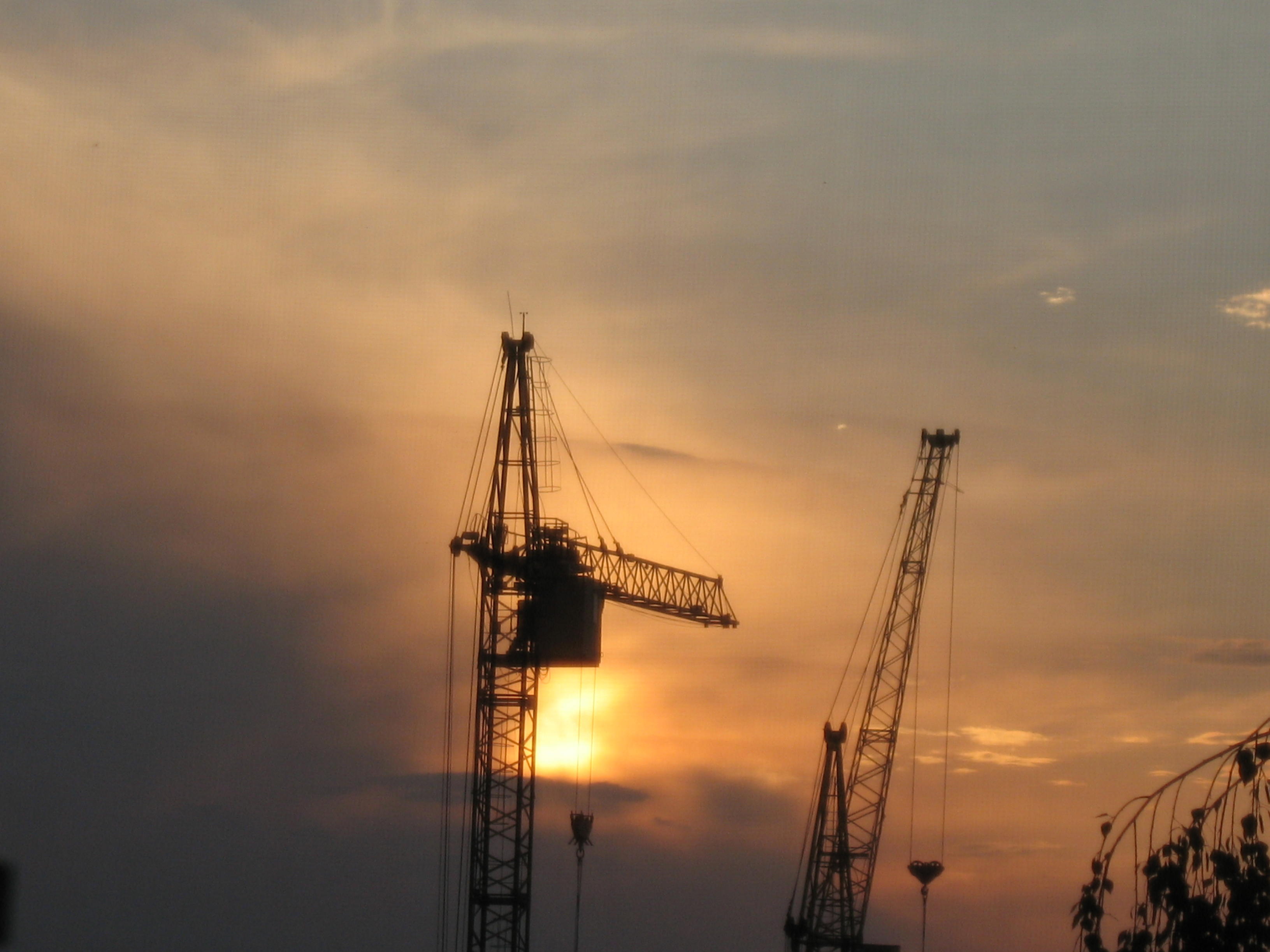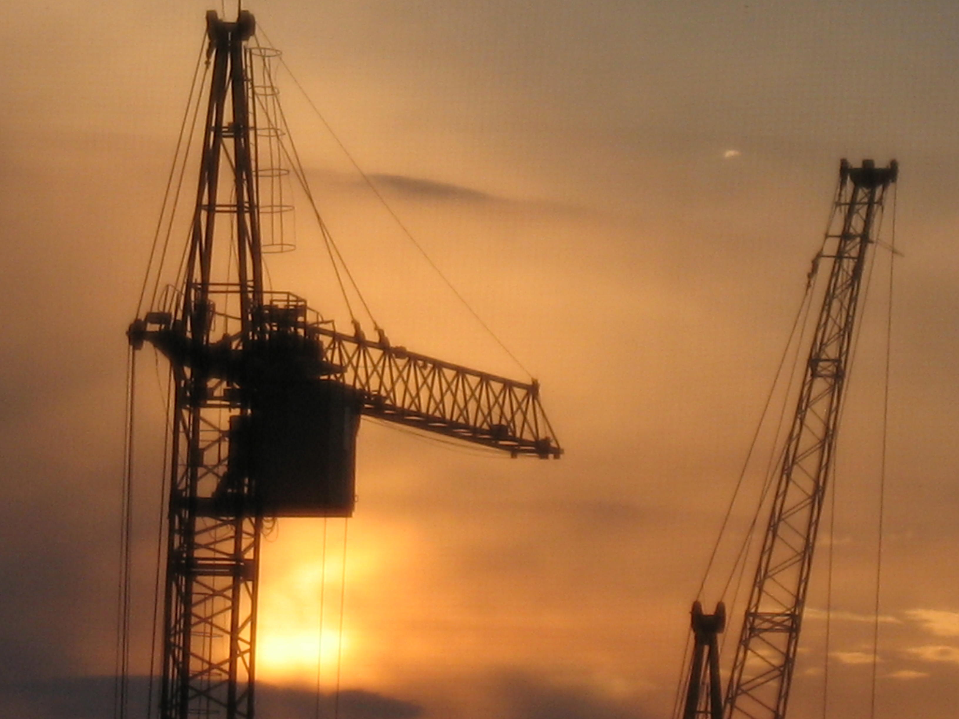 Тёмная синева окружает величавые строительные краны,