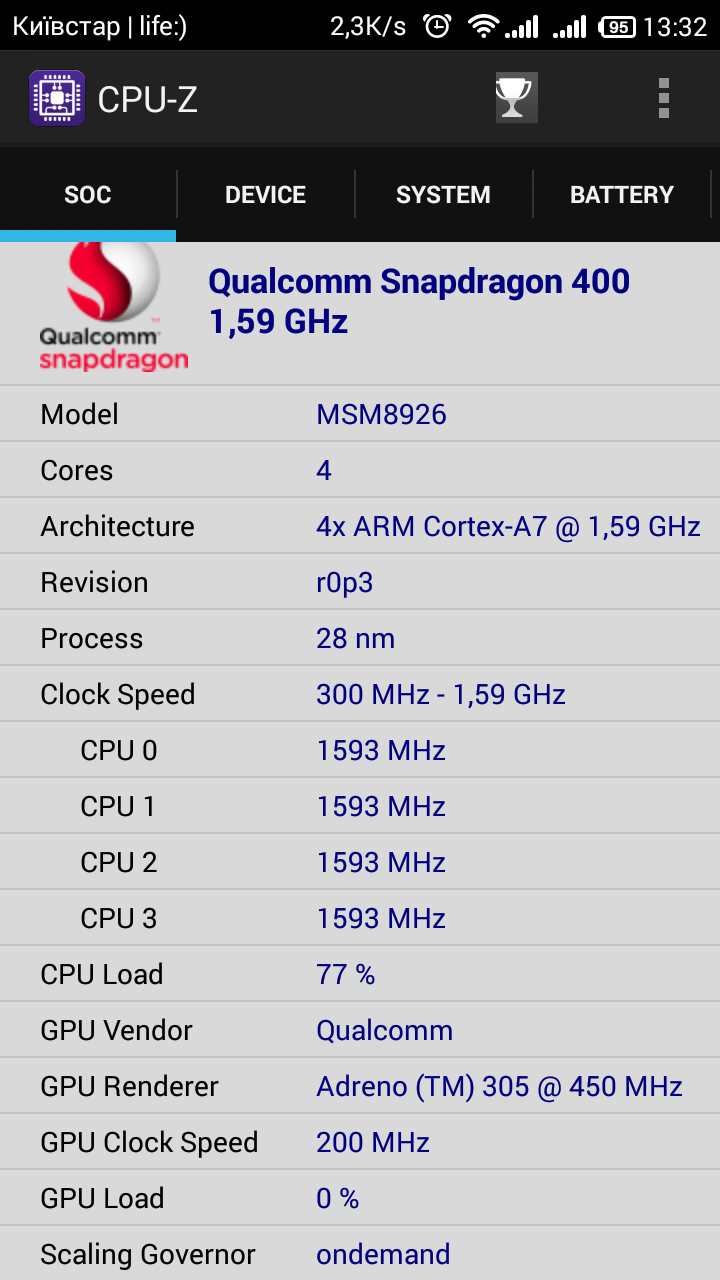 Процессор: Qualcomm Snapdragon 400 MSM8628, 4 ядра, 1785 Мгц + Adreno 305