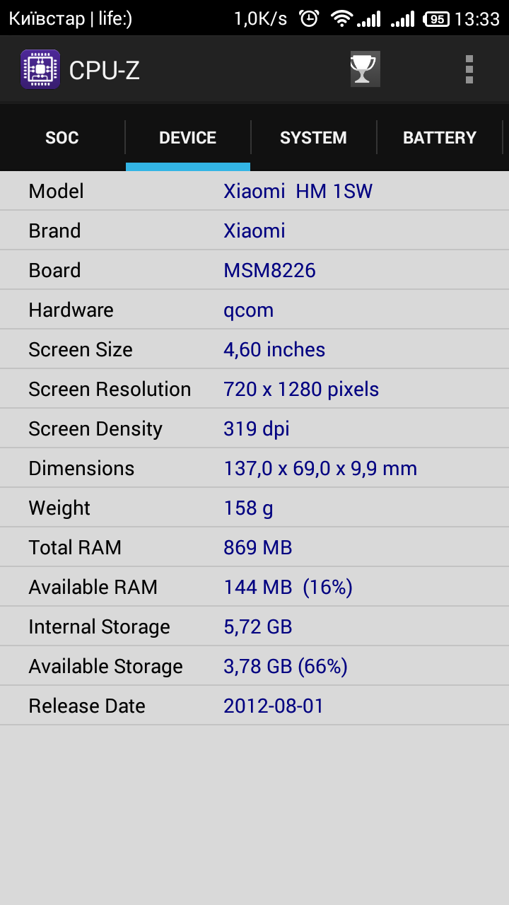 Технические характеристики Xiaomi Redmi 1S CDMA+GSM