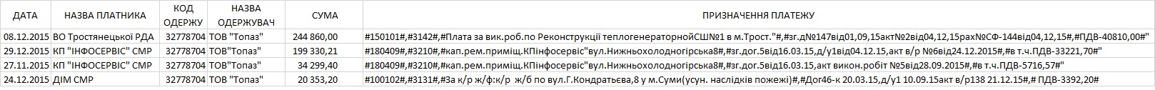 Таким чином ТОВ «Топаз» отримало від сумського міського управління кап будівництва два підряди на загальну суму майже 1,6 млн. грн.