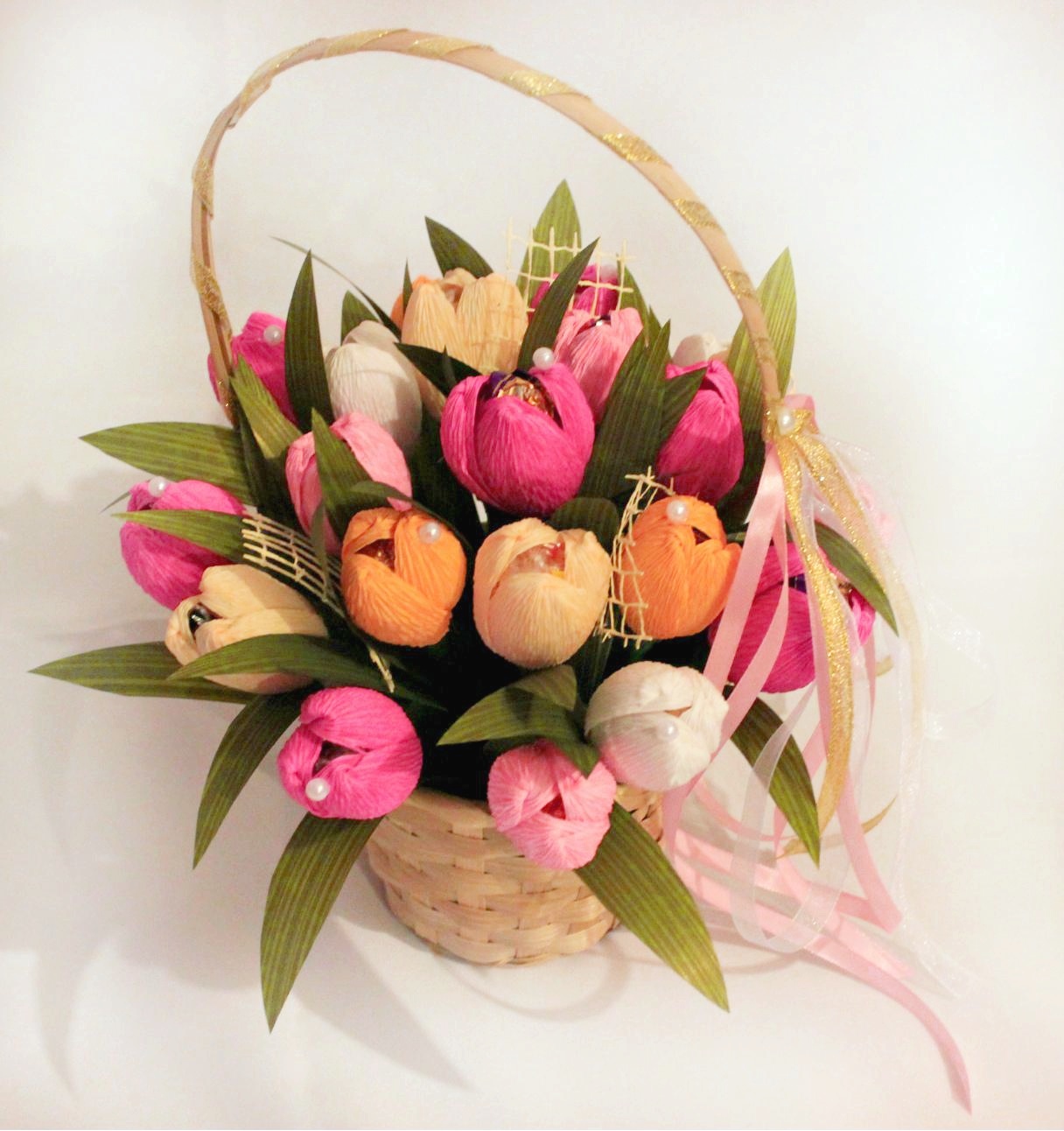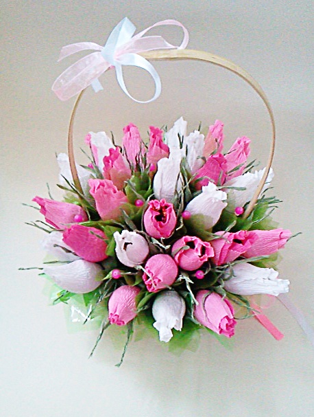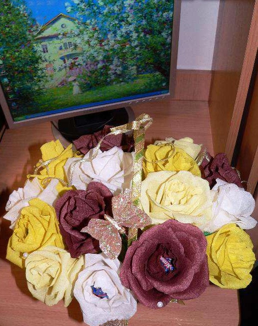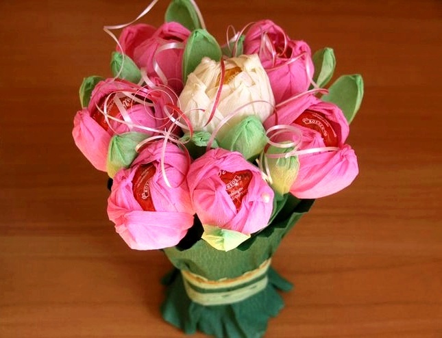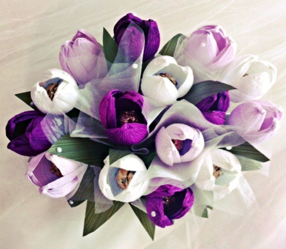 Порадуйте Ваших любимых красивым и сладким подарком! В каждом цветочке шоколадная конфетка. Цветовая гамма и наполнение букета под заказ. Учитываются любые Ваши пожелания! Время изготовления букета\композиции 1-2 дня. Возможно изготовление мини-букета (5-7 шт.) Стоимость зависит от объема (наполнения) букета (конфет, пр.сладостей, их количества). Цена 100-250 грн.
