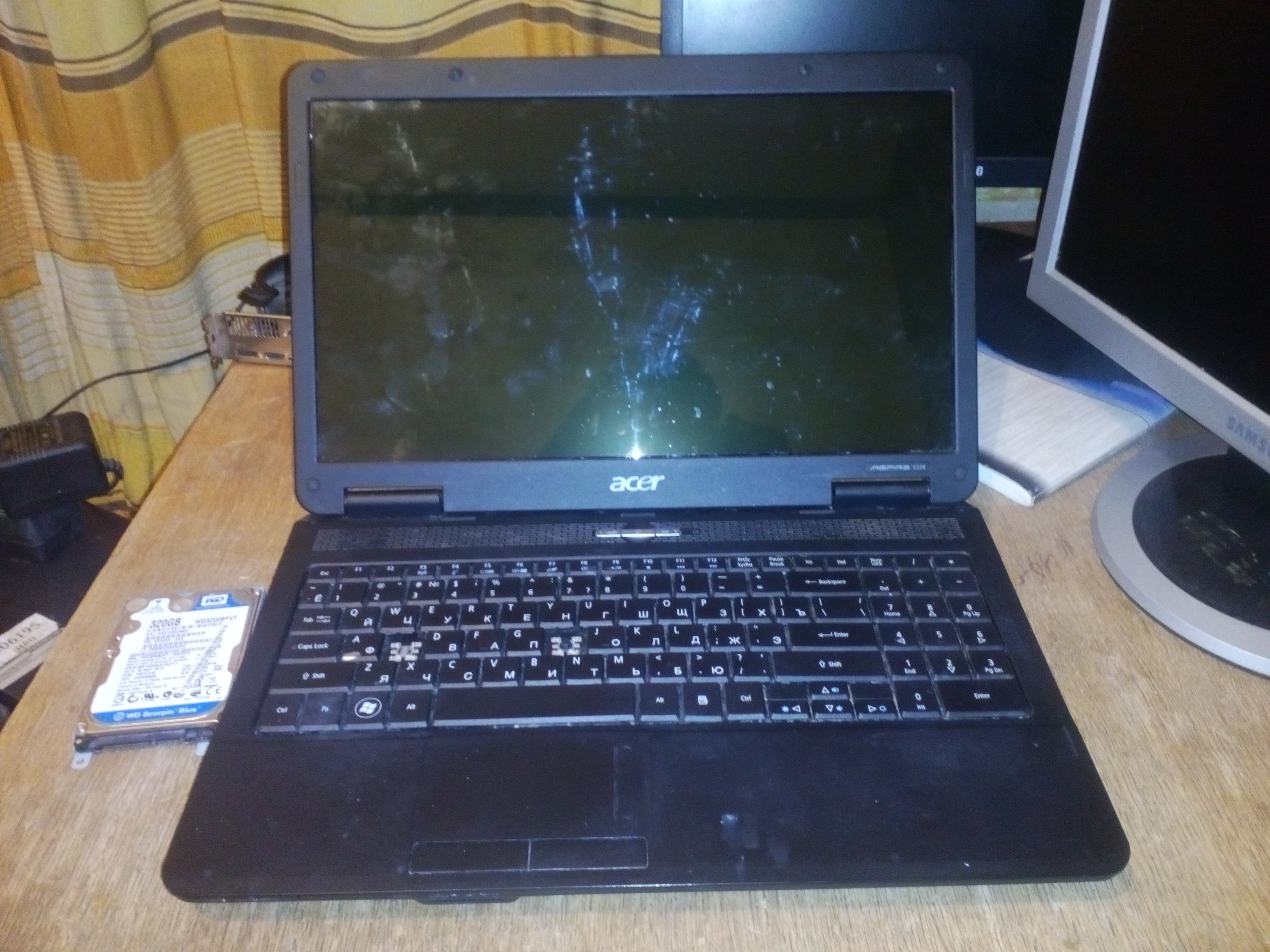 Ноутбук рабочий, без пыли, термопаста заменена, умирает жесткий диск, нет двух кнопок на клавиатуре.
