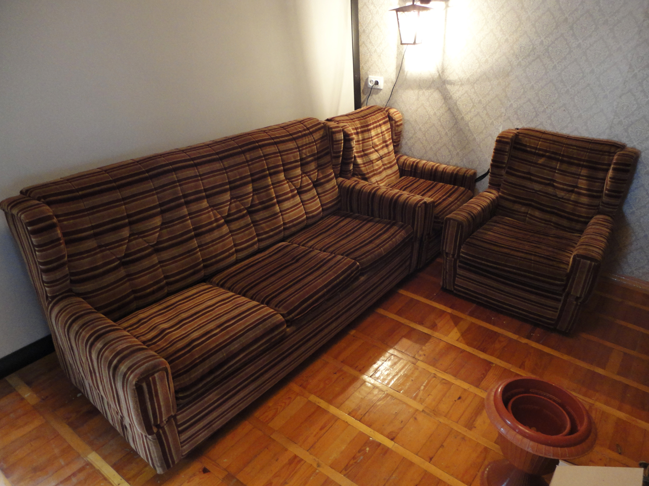 Состояние очень хорошее. Обшивка плотная. Каркасы мебели целые. Основание сидений и спинки - пружинные. Пуфы - поролон.